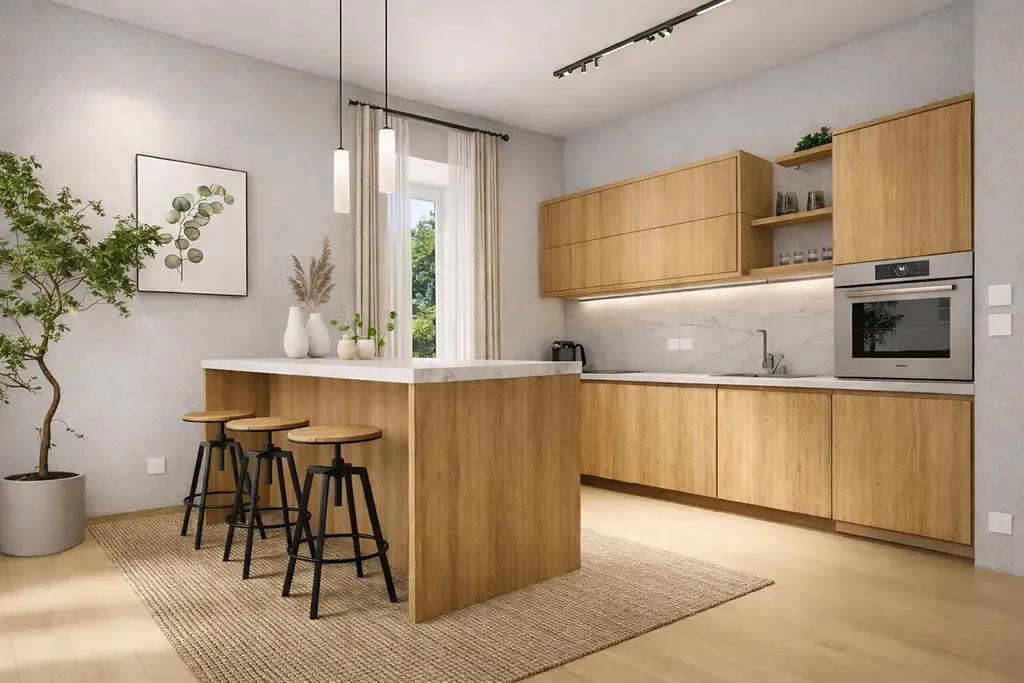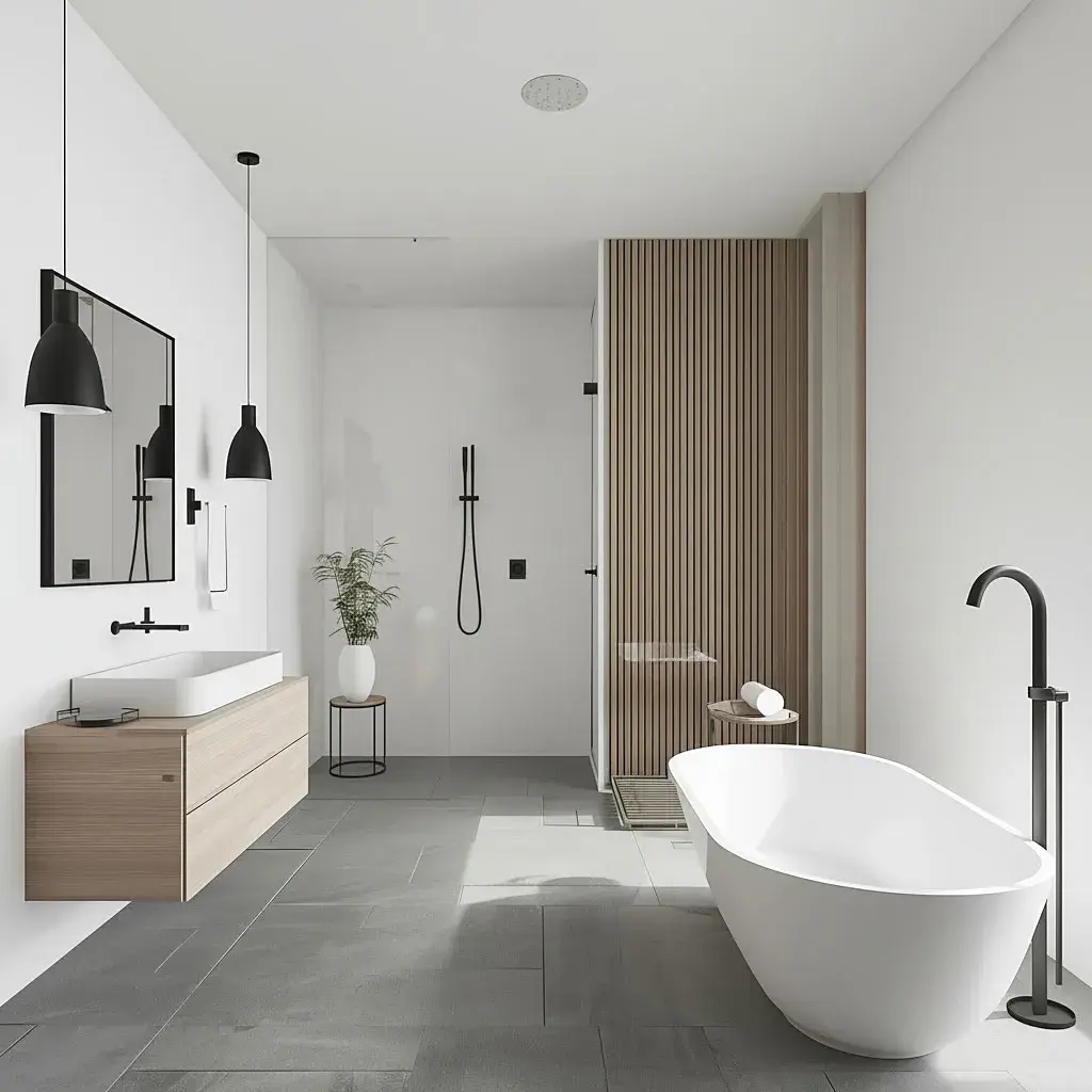 Teplovodní podlahové vytápění, kvalitní podlahové krytiny (vinyl/keramická dlažba), závěsné WC...