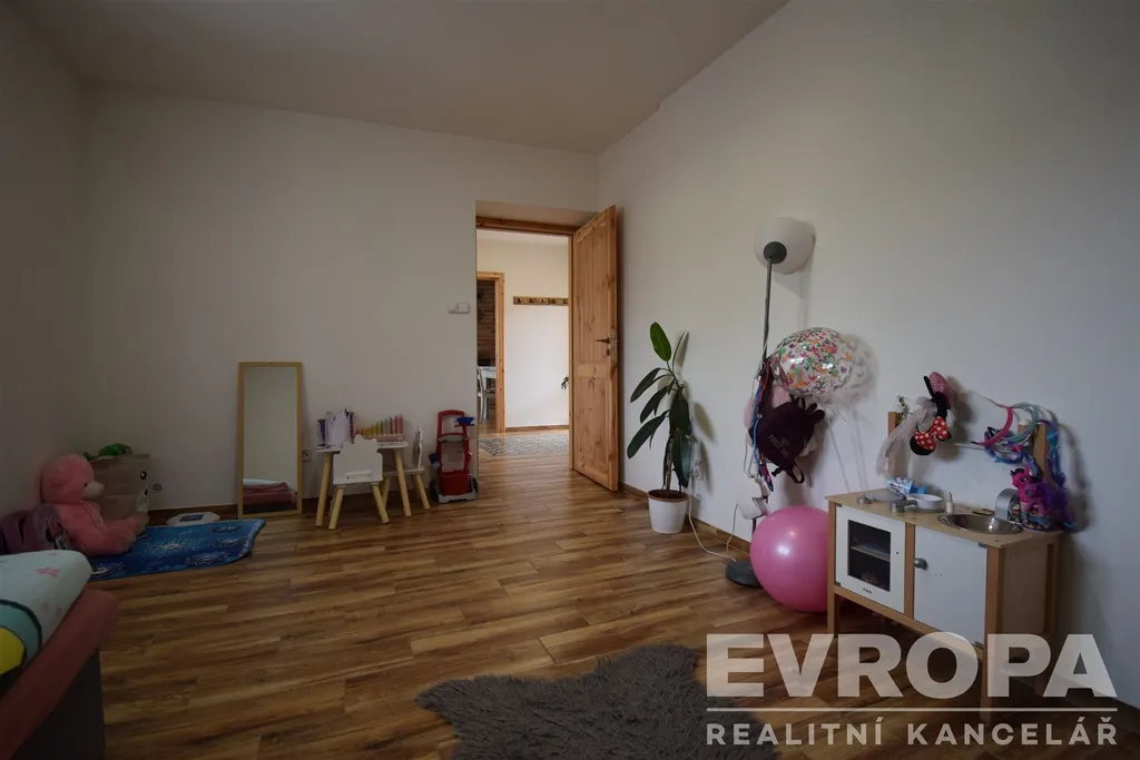 Ve výhradním zastoupení Vám nabízíme hezký a útulný rodinný dům o dispozici 3+kk s užitnou plochou 72 m2. Dům stojí na pozemku o velikosti 266 m2 se zastavěnou plochou 102 m2. Dispozice domu je prakticky řešena. Vchod do domu je situován z východní strany domu a to z vlastního pozemku. Za vchodovými dveřmi je vstupní hala (5,26 m2), ze které se vchází přímo do jednotlivých místností, koupelny se sprchovým koutem a WC (5,36 m2), do dětského pokoje (14,6 m2), do ložnice (13,79 m2), do technické místnosti (1,26 m2) a dále do hlavní části domu, tj. kuchyňský kout s jídelnou a obývacím pokojem (31,64 m2).