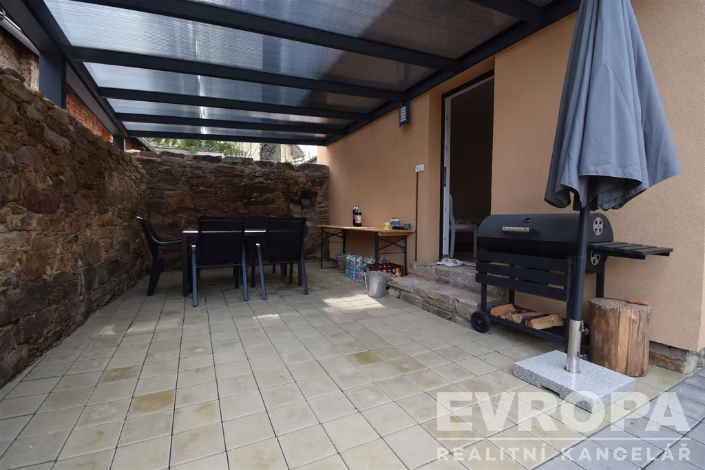 Rekonstrukcí prošlo i okolí domu, předzahrádka a vlastní dvorek, který je zpevněný zámkovou dlažbou a umožňuje tak parkování na vlastním pozemku pro dvě auta. V roce 2025 bylo provedeno nové oplocení, postaven malý zahradní domek a vybudována velká kovová pergola se střešní krytinou z polykarbonátu. Prostorná pergola nabízí v letních měsících příjemné venkovní posezení a v zimních měsících se tento prostor dá využít jako přístřešek pro osobní auto.