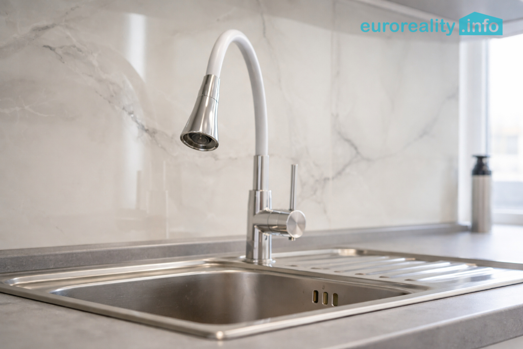 Součástí prodeje je také moderní kuchyňská linka se zabudovanými spotřebiči, konkrétně: