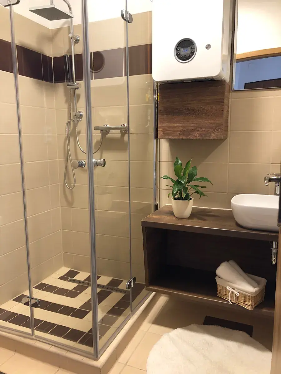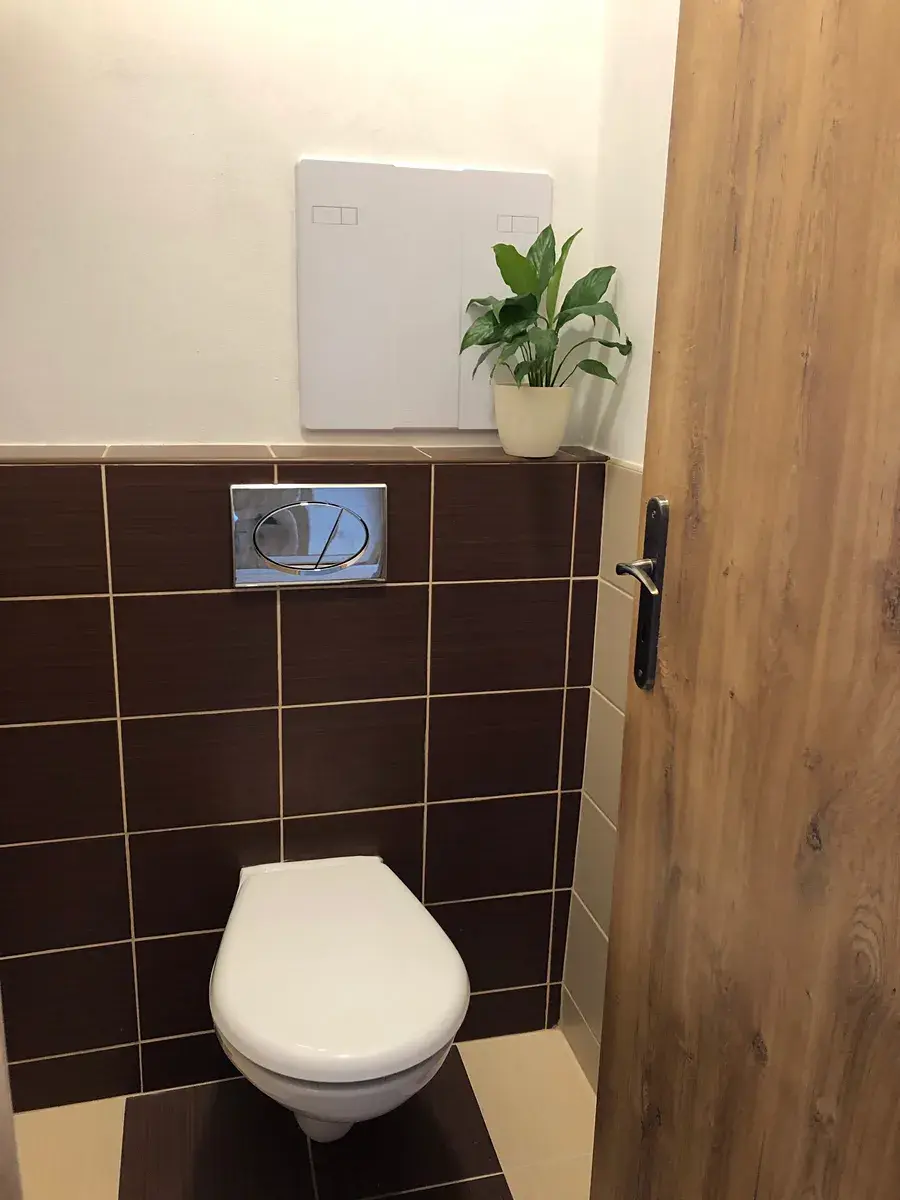 Z předsíně rovně jsou přístupné koupelna a samostatná toaleta. V koupelně najdeme prostorný sprchový kout, designové umyvadlo se skříňkou, topný žebřík, nový úsporný plynový kotel (zajišťující ohřev teplé vody a vytápění bytu) a dále je zde příprava pro pračku.