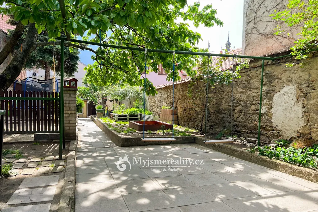 Za kamennými hradbami domu se nachází malebná privátní zahrada, která poskytuje příjemné zázemí a soukromí v centru města. Na zahradě se nachází dílna a dřevník (pozemek pod těmito dvěma stavbami není součástí prodeje, ale nový majitel jej může nadále využívat).