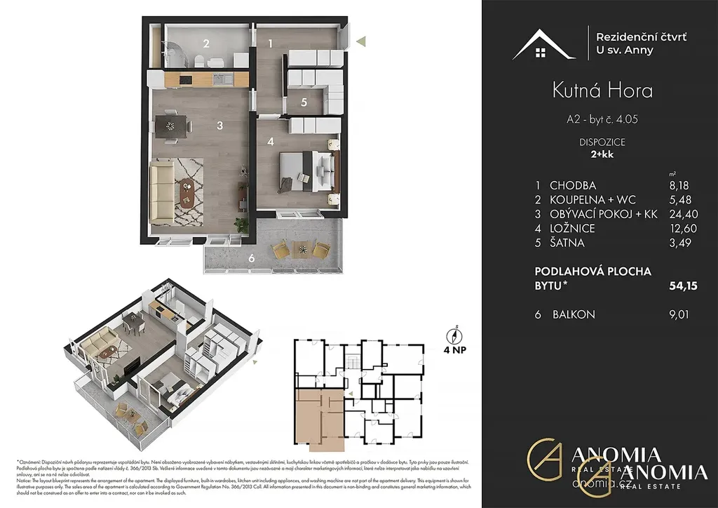 Bytová jednotka s projektovým označením 04.05 o dispozici 2+KK se nachází ve 4. nadzemním podlaží bytového domu BD_A2. Dům bude postaven jako energeticky úsporný s důrazem na použití kvalitních materiálů, které zajistí vysoký standard bydlení. Součástí je také zvuková izolace, která poskytne maximální pocit soukromí a klidu pro všechny obyvatele.