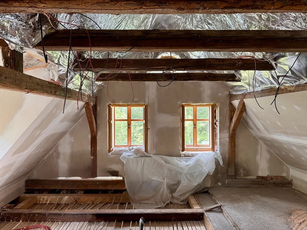 nová provětrávaná zateplená hliníková střecha, zateplené podlahy v přízemí, tepelné čerpadlo, podlahové topení a radiátory, velká část elektroinstalace, všechna okna nová špaletová modřínová, očištěná fasáda připravená k zateplení