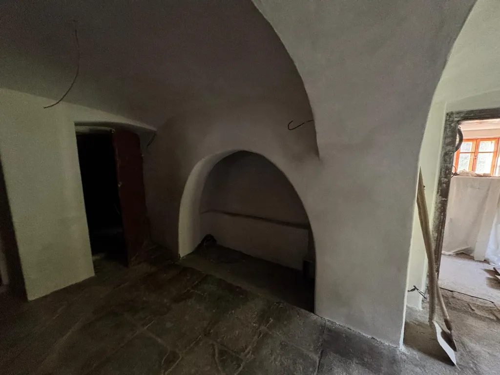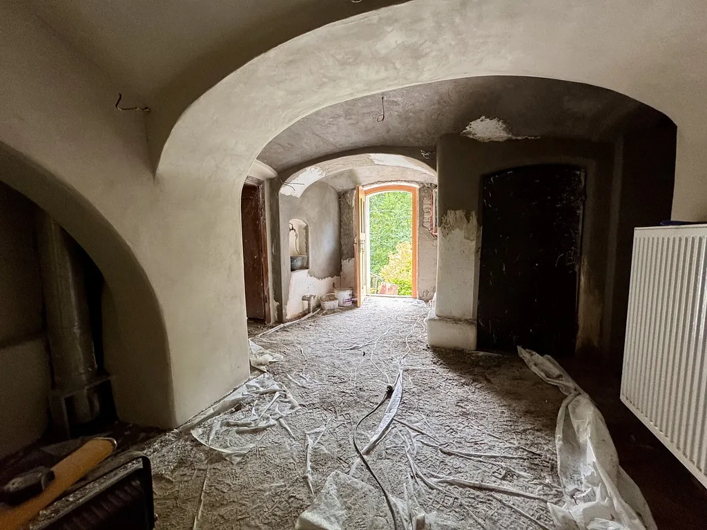 vstupní klenutá hala se schodištěm do patra, hlavní síň s kuchyní a spíží, ložnice, klenutá koupelna s WC, kamenný klenutý prostorný sklep,