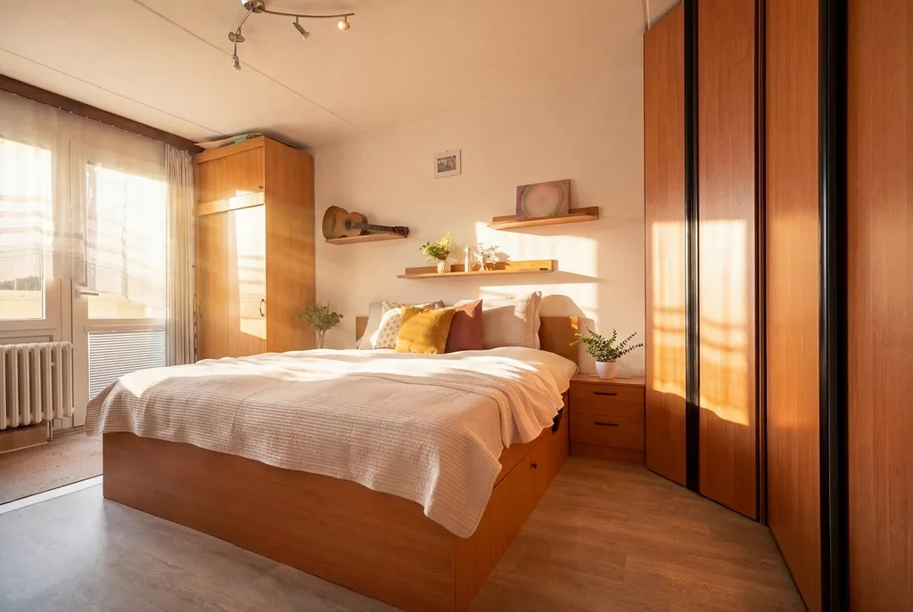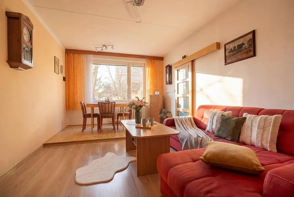 Dominantou bytu je prostorná hlavní ložnice, ve které se nachází vestavěná skříň poskytující praktické úložné prostory. Druhý pokoj může sloužit jako dětský pokoj, pracovna nebo pokoj pro hosty. Obývací pokoj je propojen s jídelním koutem, což vytváří příjemný otevřený prostor ideální pro společné chvíle s rodinou či přáteli.