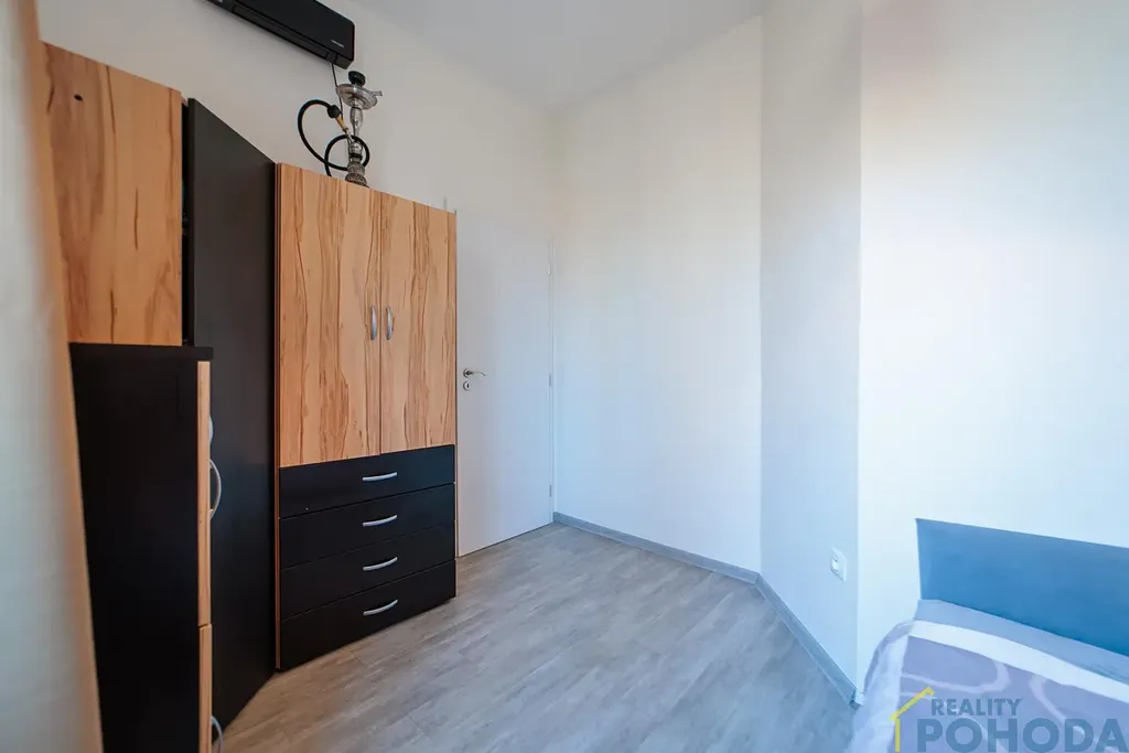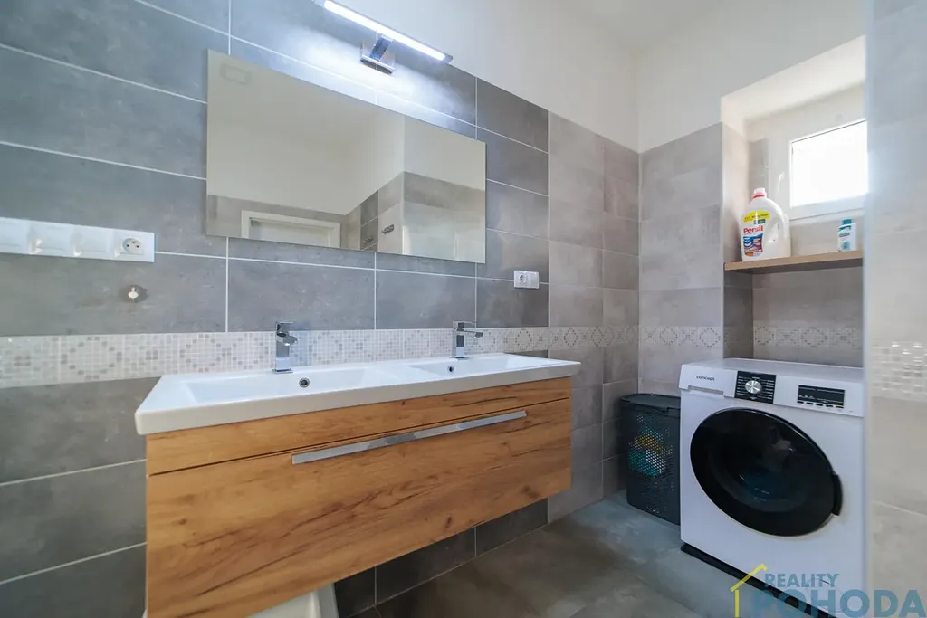 Aktuálně se byt skládá z velké vstupní verandy, prostorného obývacího pokoje s kuchyňskou linkou na míru včetně vestavěných spotřebičů (trouba, mikrovlnka, myčka) a stylovým kameninovým dřezem. Dále jsou zde dva pokoje a krásná koupelna s rohovou vanou, dvojumyvadlem a prostorem pro pračku i sušičku. Toaleta je samostatná. V obytných místnostech je položena kvalitní vinylová podlaha, zatímco koupelna a toaleta jsou řešeny dlažbou. Plastová okna s moderními roletkami směřují do zeleně, což bytu dodává příjemný pocit klidu a soukromí.
