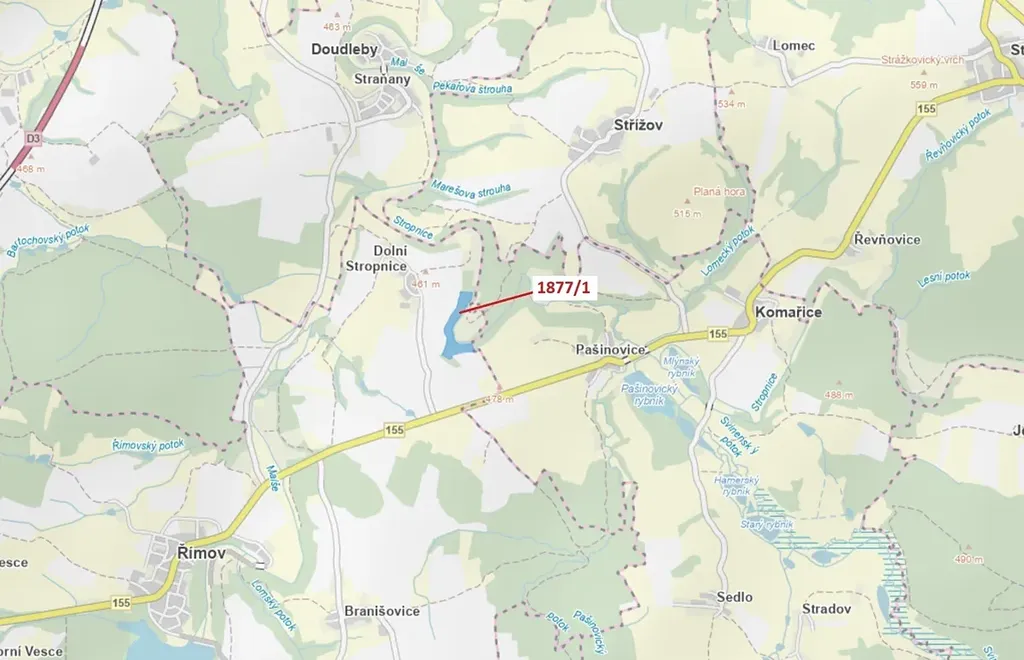Lesní pozemek o výměře 49 760 m2, parcelní číslo 1877/1, podíl 1/1, katastrální území Dolní Stropnice, obec Římov, obec s rozšířenou působností České Budějovice, okres České Budějovice, Jihočeský kraj.