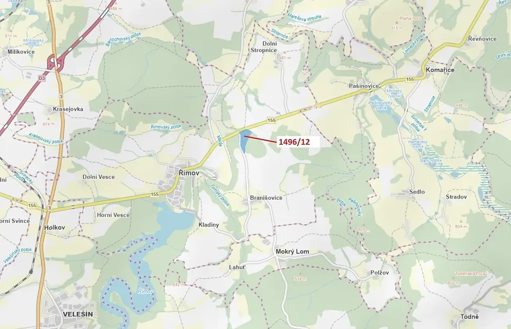 Lesní pozemek o výměře 52 265 m2, parcelní číslo 1496/12, podíl 1/1, katastrální území Dolní Stropnice, obec Římov, obec s rozšířenou působností České Budějovice, okres České Budějovice, Jihočeský kraj.