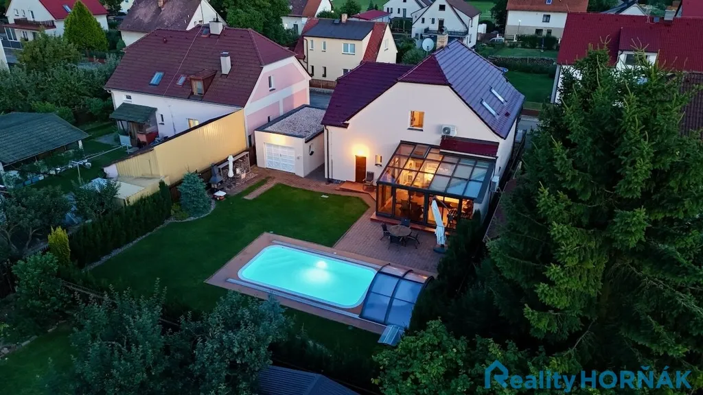 V nevelké zahradě zabudován bazén 6 x 3 m se slanou vodou a protiproudem, zastřešený antiUV moduly, přelivový, vyhřívaný čerpadlem, pochozí plocha z materiálu Piedra. Užívání vhodné zpravidla květen – září.