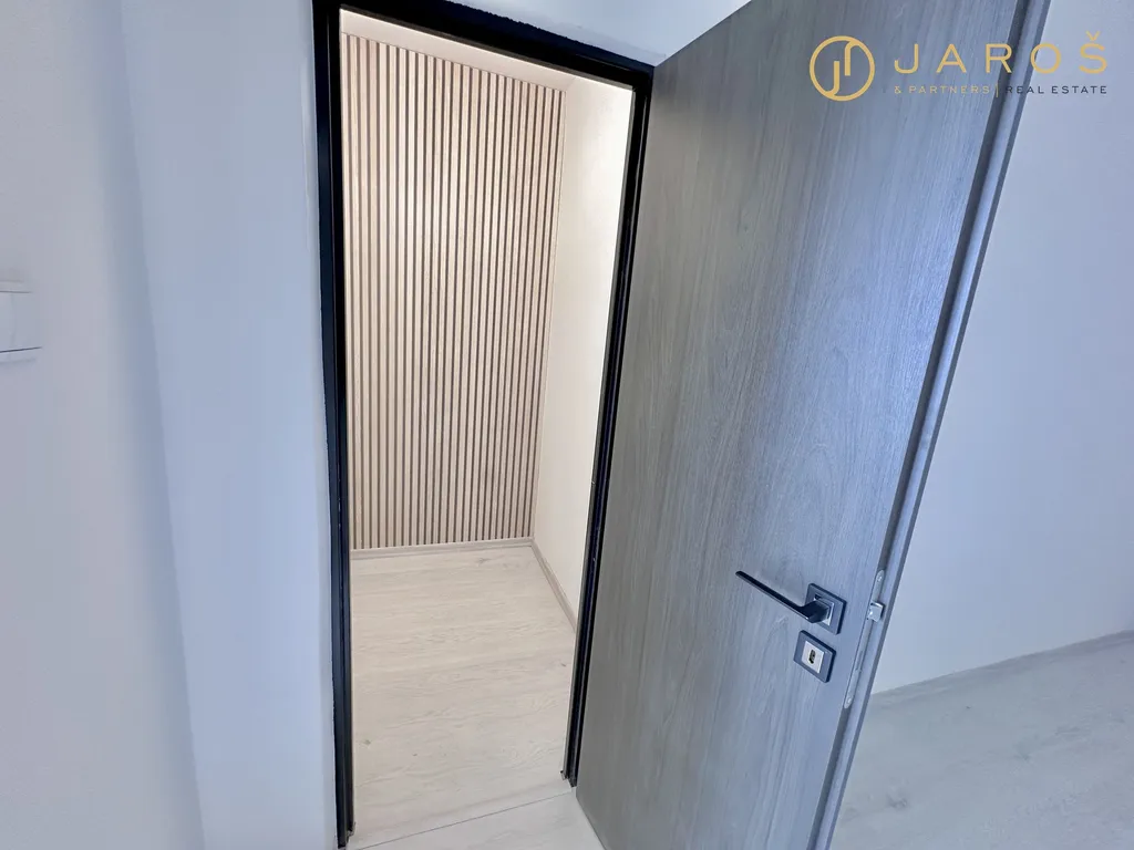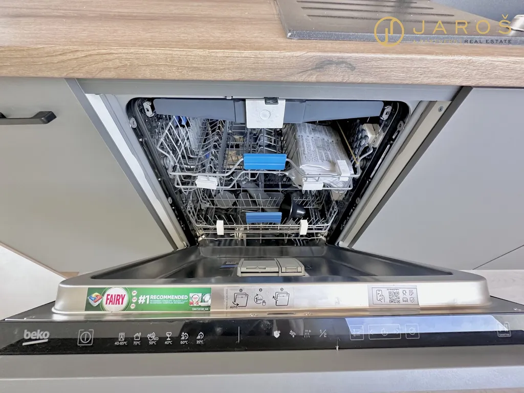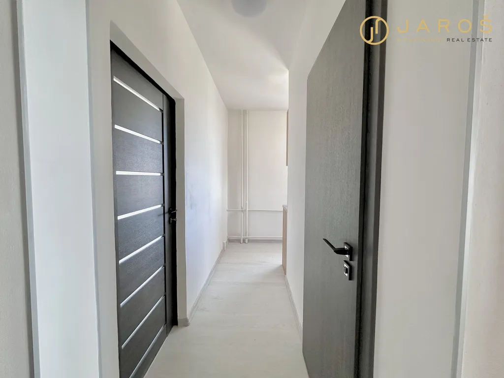 Byt se skládá z prostorné vstupní chodby, úklidové místnosti, kuchyně s moderní kuchyňskou linkou (včetně myčky, elektrické trouby a mikrovlnné trouby) a dvou samostatných neprůchozích pokojů. K bytu náleží také sklep. Nabízí se jako nezařízený.