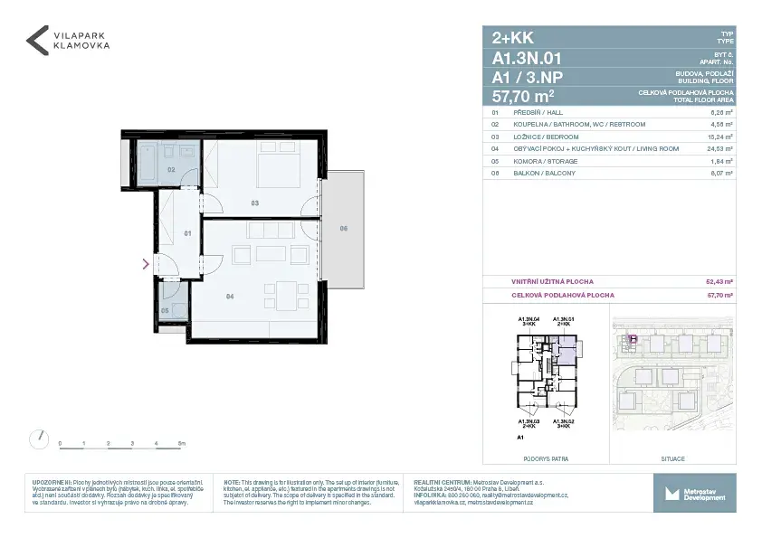 Byt má výměru 57,70 m2 + balkon 8,07 m2, nachází se ve 3. nadzemním podlaží s výtahem. Sklepní kóje a parkovací stání se nachází v 1. podzemním podlaží. Bytová jednotka je napojena na elektřinu, vodovod a kanalizaci. Vytápí se ústředním dálkovým topením.