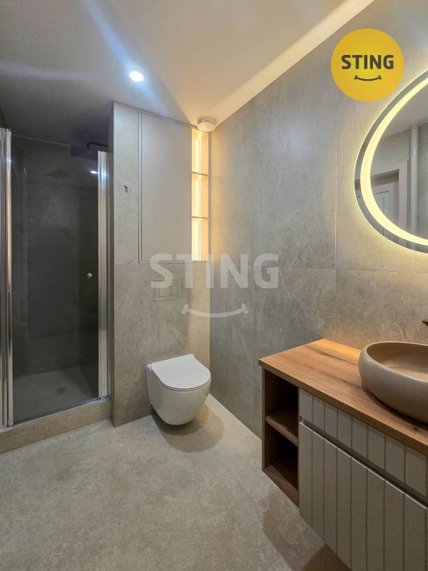 Rekonstrukce byla provedena profesionálně s ohledem na detail, funkčnost i praktičnost při zachování důrazu na estetiku. Byla provedena nivelace podkladu v celém bytě, položena vinylová podlaha ve stejném dekoru. Koupelna je zděná, zvětšená, vznikl tak prostor pro komfortní sprchovací kout, umyvadlo s nástěnnou skříňkou, je zde příprava pro pračku a sušičku, nechybí závěsné WC s integrovaným splachováním v dekoru velkoformátových obkladů. Příjemné světelné oživení celé koupelny díky modernímu deisnovému LED osvětlení je nadstandardní.