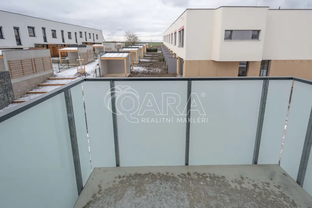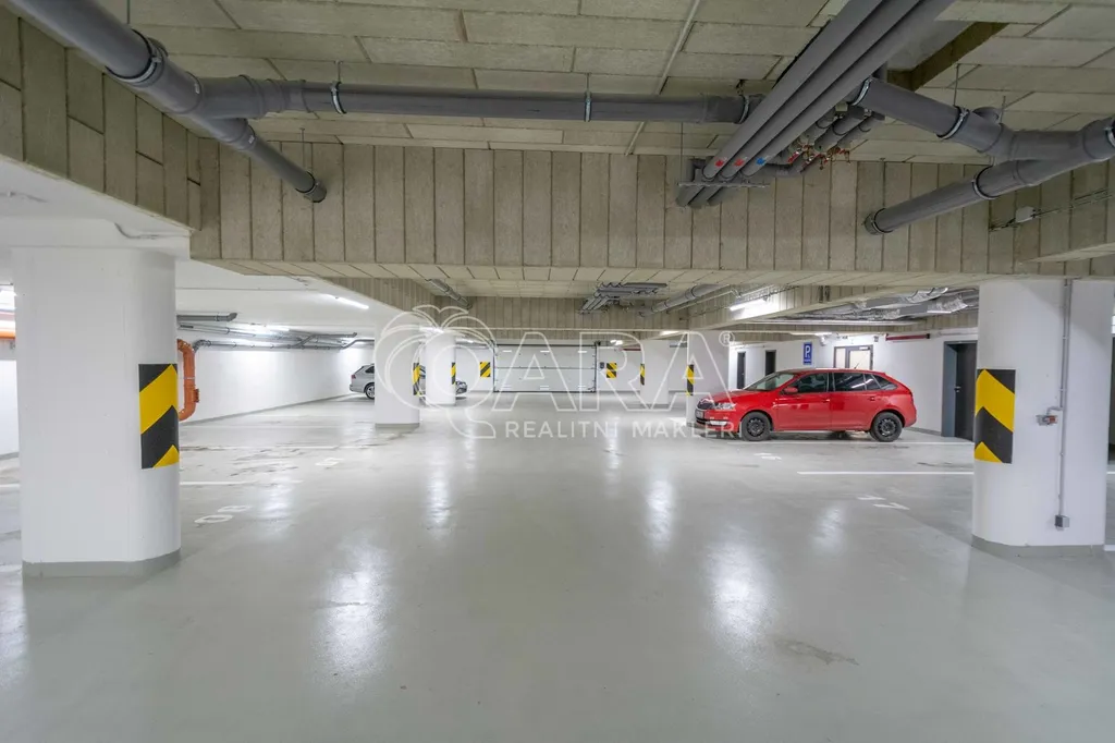 Dispozice bytu ve 2. NP: vstupní chodba se šatní skříní, koupelna s vanou, pračkou a WC, ložnice, obývací pokoj s kuchyňským koutem a vstupem na balkon. K bytu patří sklepní koje a vnitřní parkovací stání.