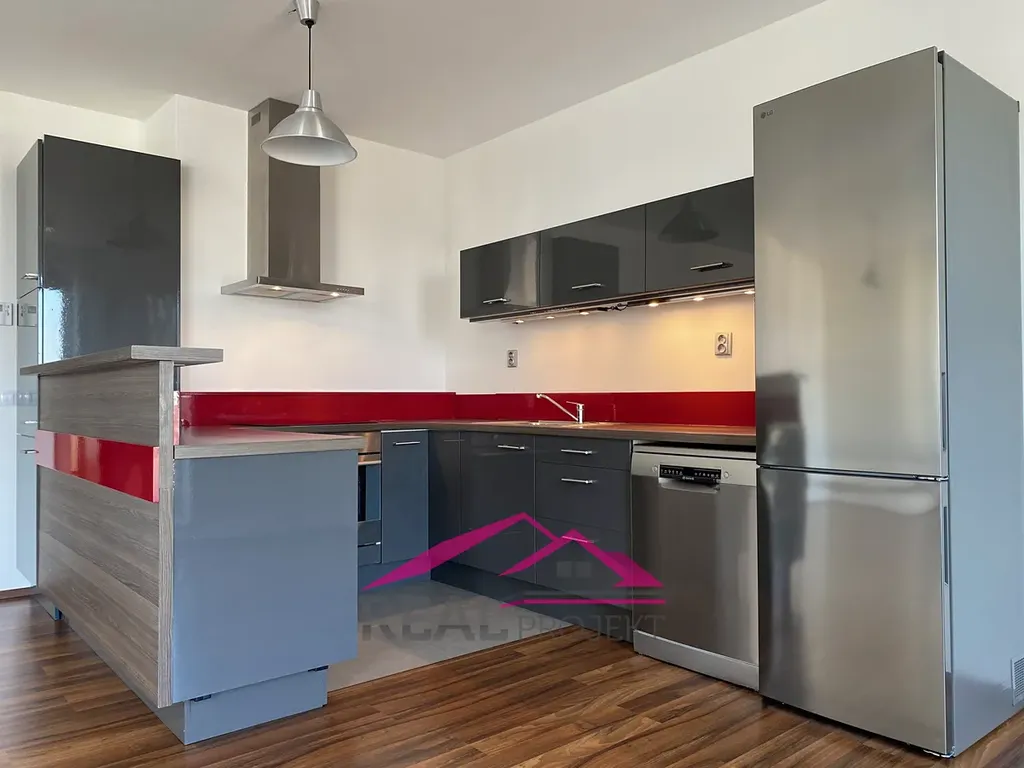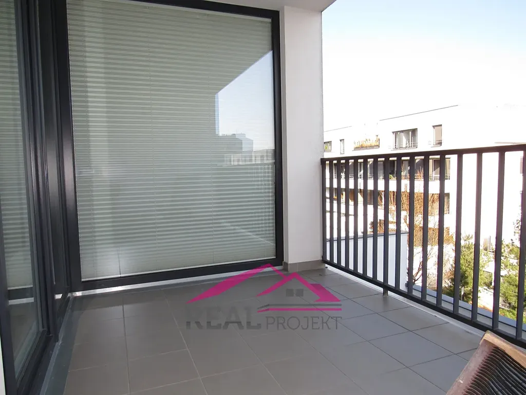 Dispozičně je tento byt velice komfortně řešen. Vstupní hala o ploše 5,7 m2 se šatní skříní, dále obývací pokoj s kuchyňským koutem o rozloze 33,3 m2 a vestavnými spotřebiči, obývací pokoj s velkoformátovými okny, francouzskými dveřmi vstupujeme na velkou lodžii (7,3 m2) s výhledem do klidné zóny parku, ložnice o ploše 12,4 m2, koupelna s WC, ve které je zbudován sprchový kout i vana o ploše 6.7 m2.