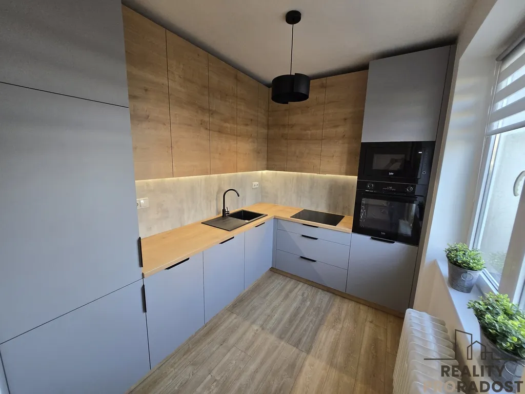 Součástí bytu je také nová kuchyňská linka na míru vybavená vestavnými spotřebiči se zárukou 2 roky – trouba, mikrovlnná trouba, varná deska a digestoř.