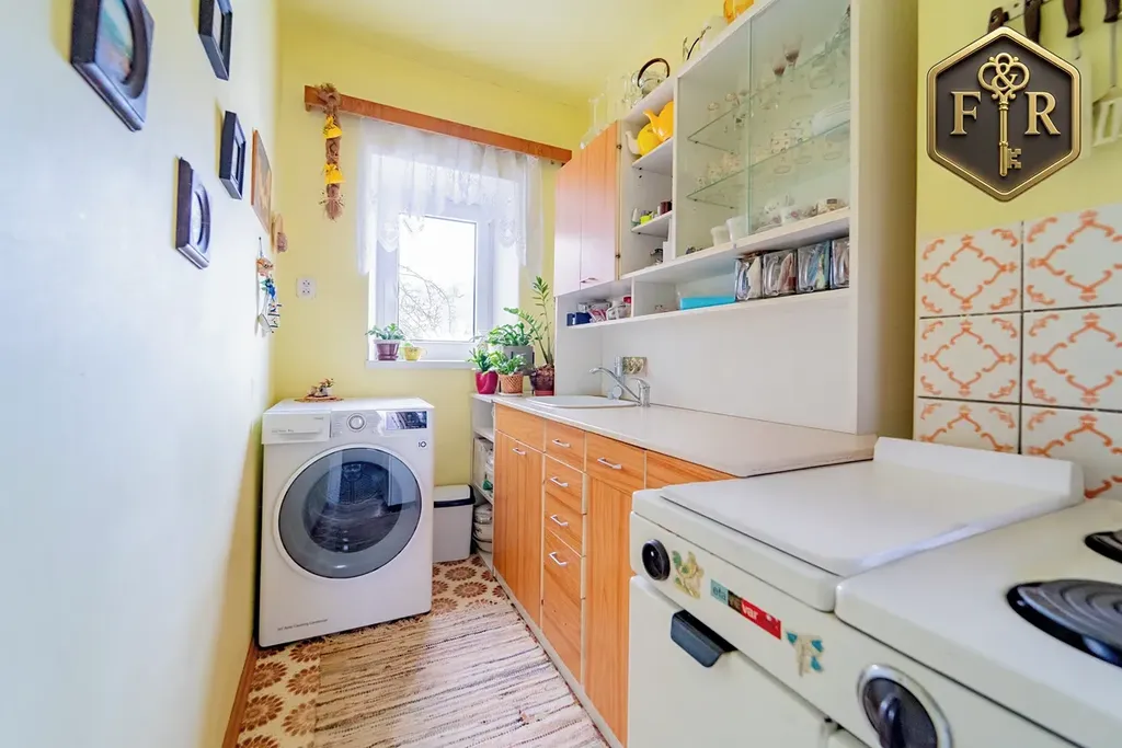 Dispozice domu je 5+kk (PP: sklady, kotelna; 1.NP: 2 pokoje, kuchyně, koupelna, WC; Podkroví: 3 pokoje, kuchyňský kout, balkon, WC)