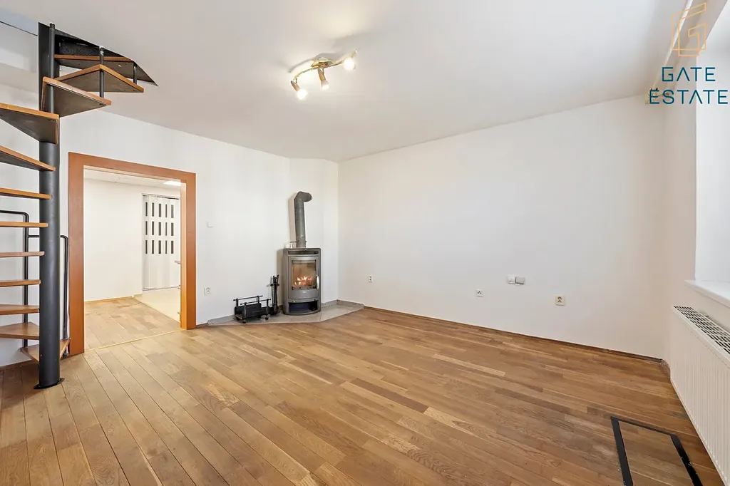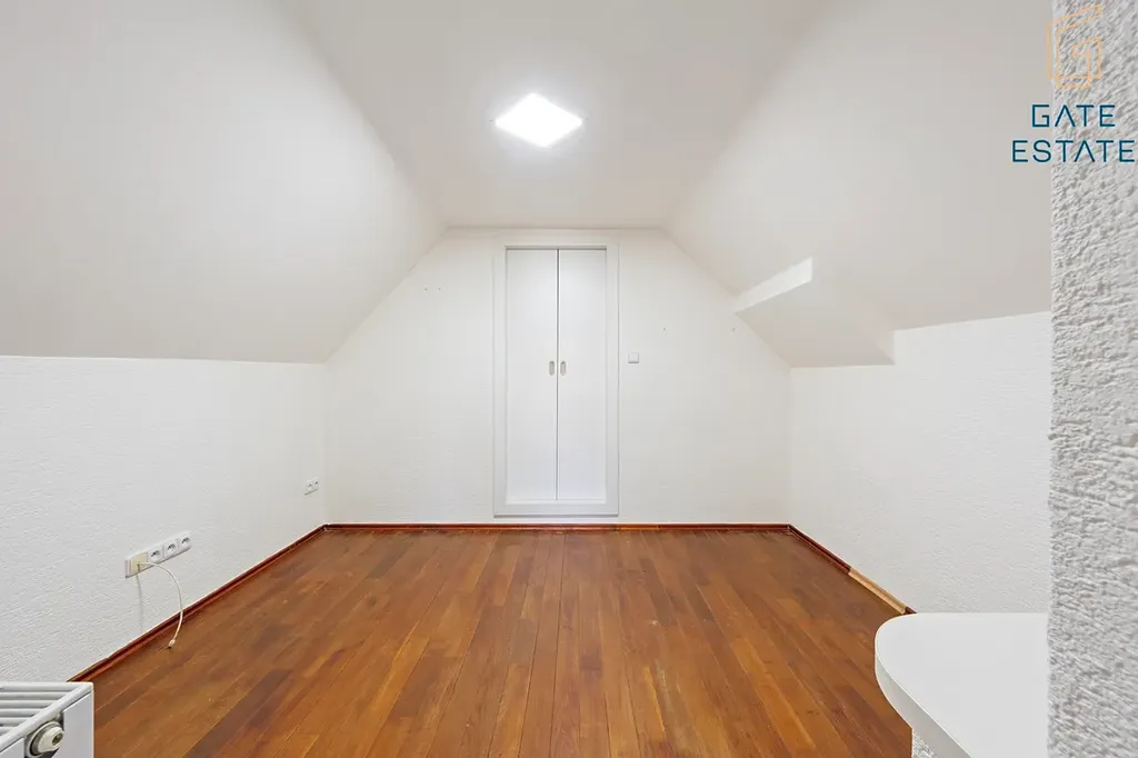 Odtud vede točité schodiště do podkroví, kde se nachází další místnost vhodná například jako ložnice, pracovna nebo pokoj pro hosty. Na ni navazuje další prostor, který lze využít například jako šatnu nebo menší pokoj.