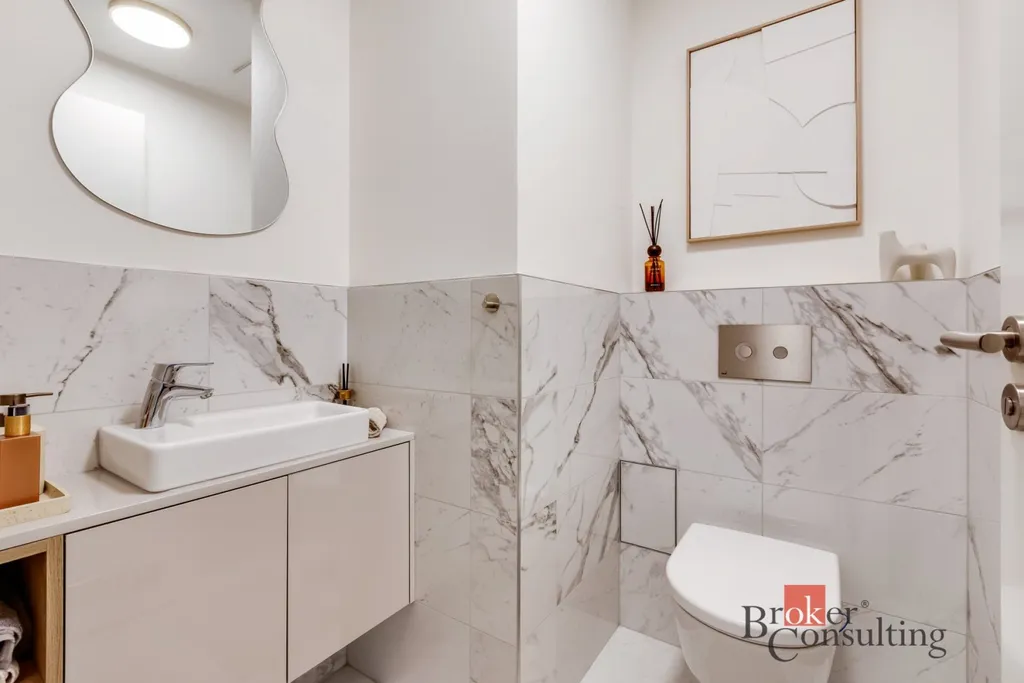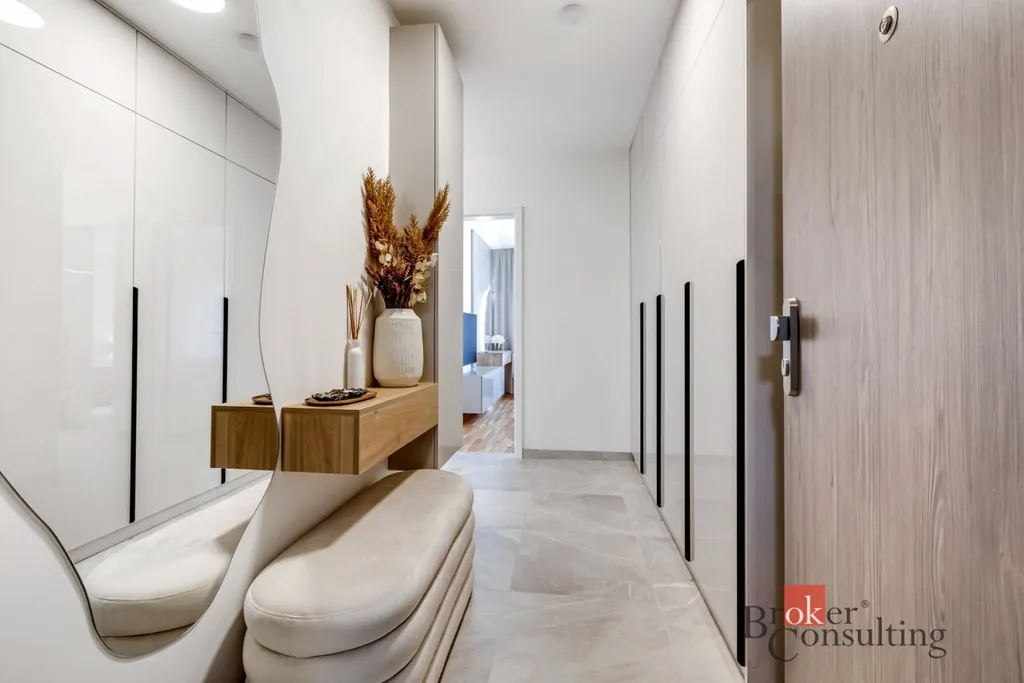 Nábytek i doplňky pocházejí od renomovaných italských značek a vytvářejí příjemnou a kultivovanou atmosféru pro komfortní bydlení. Byt se pronajímá kompletně zařízený – od kávovaru až po pračku a sušičku. Stačí přijít s kufrem a začít bydlet.