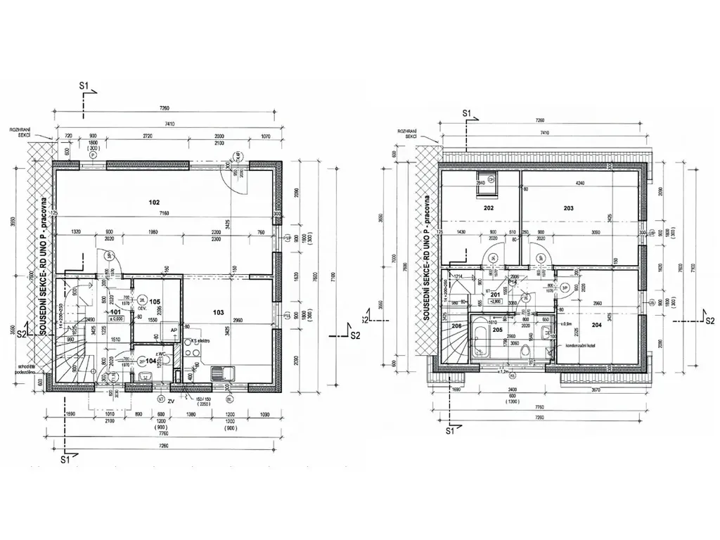 Současná dispozice domu je 4+kk o obytné ploše 96m2 a je rozložena do 2 nadzemních podlaží.