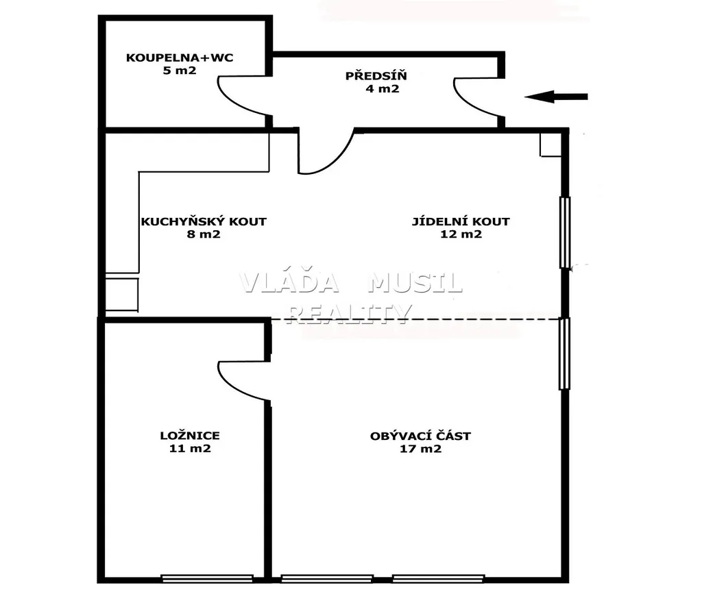 Jde o kompletně zrekonstruovaný byt o celkové rozloze 60 m², který se nachází se v 1. patře (také zrekonstruovaného) cihlového domu. V domě jsou celkem tři byty. Nabízený byt se skládá z předsíně, koupelny s toaletou, velkého obývacího pokoje s kuchyňským a jídelním koutem a samostatné ložnice. Okna jsou špaldová, orientovaná na východ a na jih, interiérové dveře jsou dřevěné, na podlahách je dlažba, v ložnici je plovoucí podlaha. Topení je podlahové, v koupelně je žebříkový radiátor. Topení a teplou vodu zajišťuje tepelné čerpadlo.