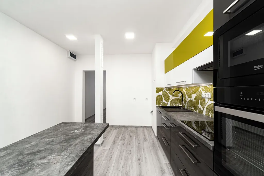 Byt je rozdělen do dvou úrovní. Po vstupu do bytu se ocitnete v útulné kuchyni, která je vybavena elektrickou indukční varnou deskou, vestavěnou elektrickou troubou a mikrovlnnou troubou. Disponuje také kuchyňským ostrůvkem, díky němu má kuchyň moderní vzhled a dostatek úložného místa. Kuchyň má také přípojky na myčku a pračku, což usnadňuje běžný provoz domácnosti. Ve spodní části bytu se nachází prostorný a slunný obývací pokoj, ideální pro odpočinek a rodinné posezení, a toaleta.