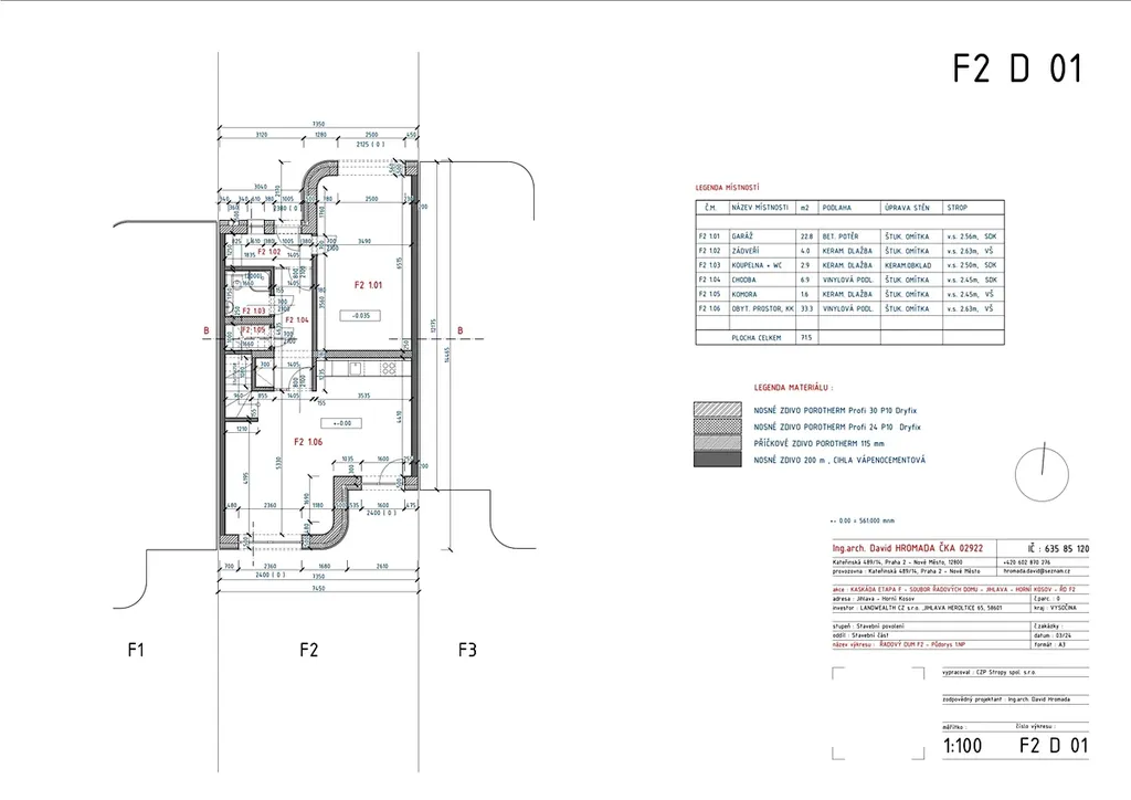 Nabízíme k prodeji řadový rodinný dům „F2“. Jedná se o patrovou cihlovou stavbu s užitnou plochou 143 m² na pozemku o rozloze 305 m², dispozice 4+kk. V přízemí, resp. 1.NP, se bude nacházet garáž, obývající pokoj s kuchyňským koutem, koupelna s WC, místnost na domácí práce a komora. V 2.NP budou tři pokoje s vlastní šatnou a koupelna s WC. Z obývacího pokoje bude výstup na zahradu (149 m2).
