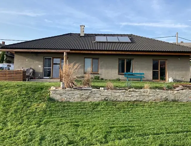 Solární panely, ohřev vody i topení elektrické. V domě jsou i kamna na topení dřevem.