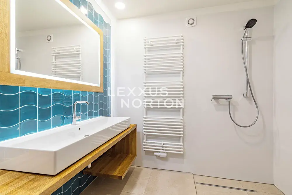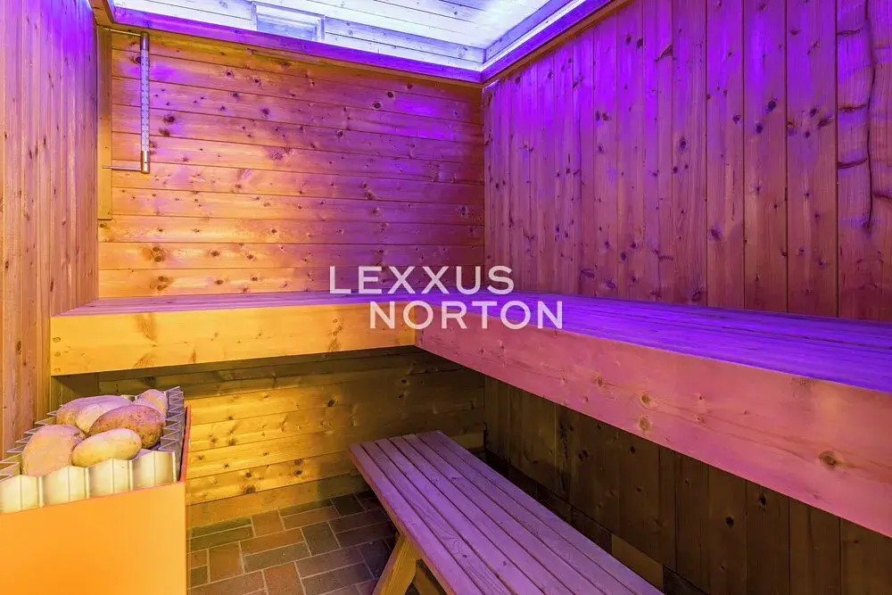 Interiér tvoří v přízemí vstupní chodba také se zadním vchodem na zahradu s bazénem, koupelna (sprchový kout) a sauna. V patře pak naleznete obývací pokoj s balkónem, kuchyň s přímým vstupem na terasu s výhledem na zahradu, koupelnu (vana a toaleta) a samostatnou toaletu. V dalším patře pak 2 ložnice a koupelnu (sprchový kout a toaleta). Suterén nabízí herní prostor pro děti nebo fitness. K domu náleží garáž a venkovní stání přímo před domem na pozemku.