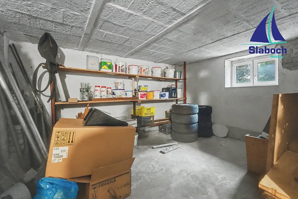 V 1 podzemním podlaží je skvělá prostorná dílna se zázemím (včetně toalety) a další sklepní prostory ve výborném stavu.