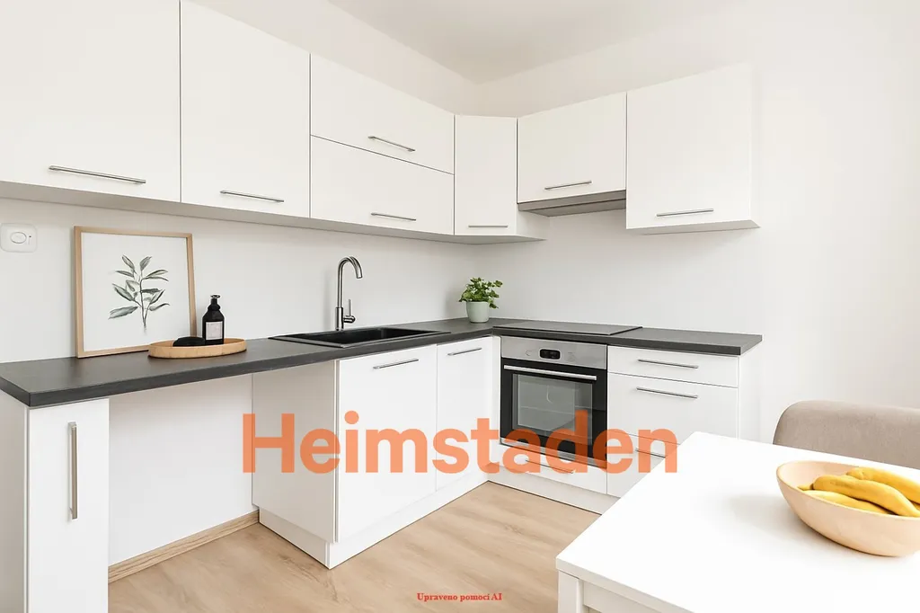 Dominantou bytu je kuchyně s rohovou kuchyňskou linkou, která je vybavena vestavěnými spotřebiči – elektrickou varnou deskou a elektrickou troubou. V předsíni, kuchyni a obývacím pokoji jsou položeny plovoucí podlahy, které interiéru dodávají jednotný a příjemný vzhled.