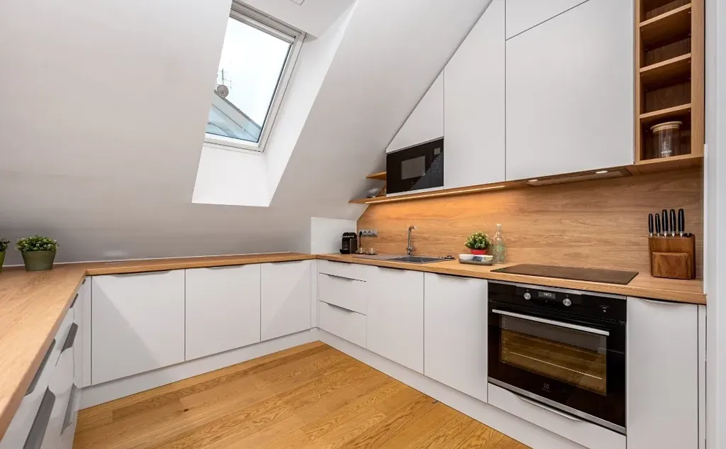 Byt splňuje nároky na moderní a komfortní bydlení ve vysokém standardu. Dominantou interiéru je designová kuchyňská linka vyrobená na míru, vybavená kvalitními vestavěnými spotřebiči – lednicí s mrazákem, indukční varnou deskou, horkovzdušnou troubou, vinotékou, myčkou nádobí a mikrovlnnou troubou.