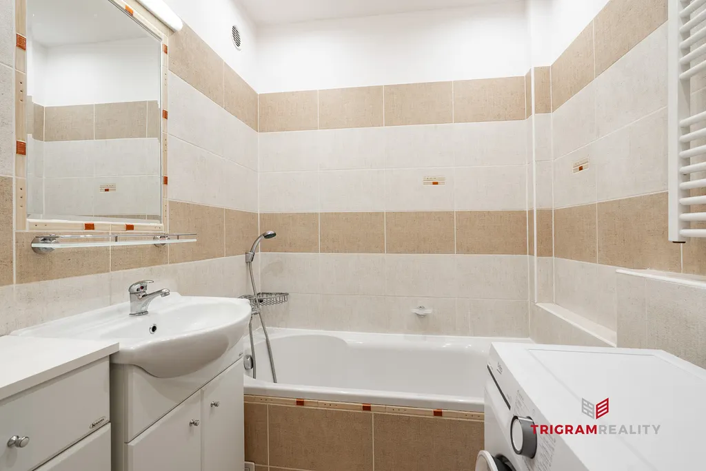 • koupelna s vanou, umyvadlem, pračkou a elektrickým žebříkovým radiátorem