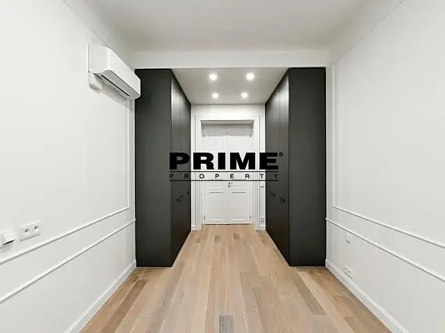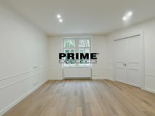 Nedávno kompletně zrekonstruovaný, 2 ložnicový (+ pracovna / malá ložnice), klimatizovaný, nezařízený (nebo po dohodě zařízený za vyšší nájem) byt s 1 koupelnou k pronájmu, 4+kk, 118m2, s malým balkonem (2m2) a garážovým stáním, situovaný v 1. patře kompletně zrekonstruovaného secesního domu s výtahem.