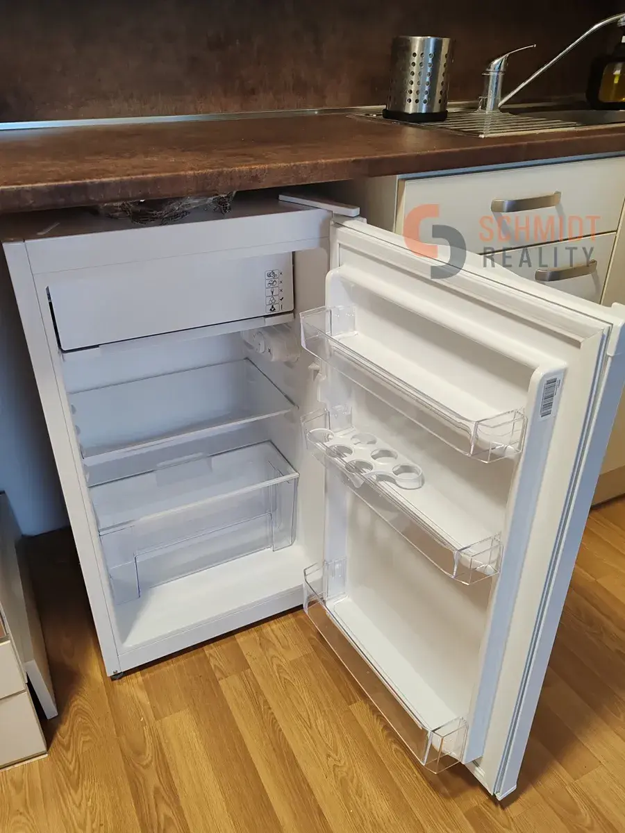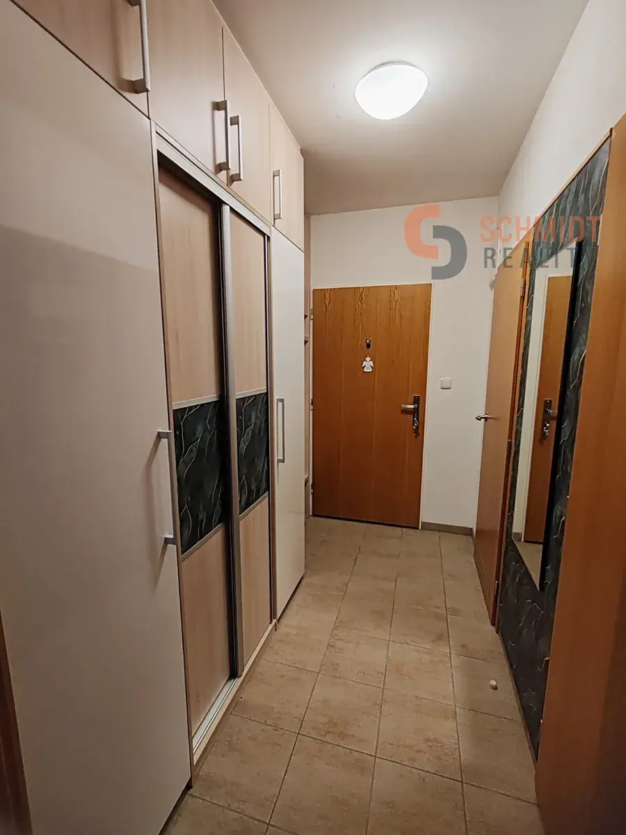 Po otevření vchodových dveří se dostanete do prostorné šatny, ve které jsou umístěny velké vestavné skříně. Po levé straně se nachází místnost vhodná pro skladování potravin. V bytě se dále nachází zděná koupelna se sprchových koutem a WC. Součástí koupelny je i pračka a skříňka pod umyvadlem. Obytná místnost je vybavena kuchyňskou linkou včetně vestavných spotřebičů (trouba a sklokeramická deska), menší ledničkou a jídelním stolem se židlemi. Je zde velké francouzské okno s dveřmi, které umožňuje vstup na terasu s výhledem na Pálavu.