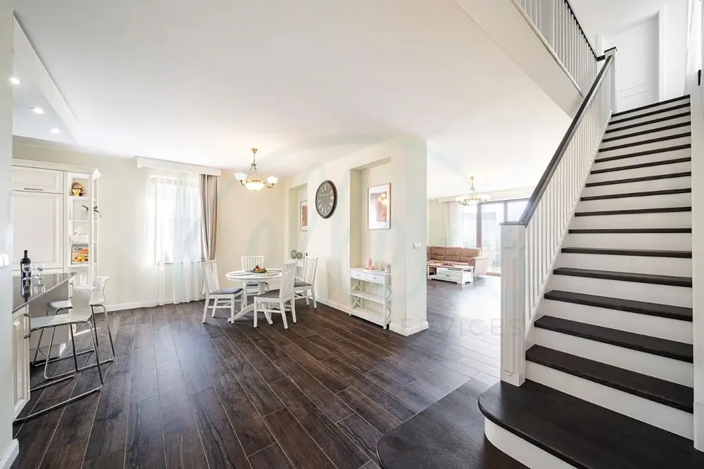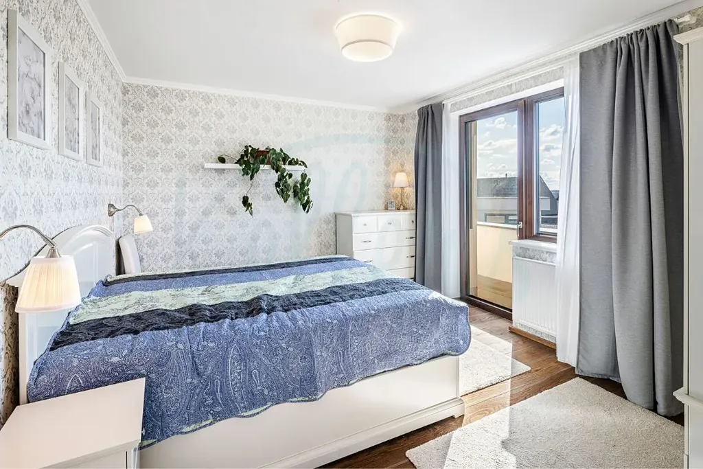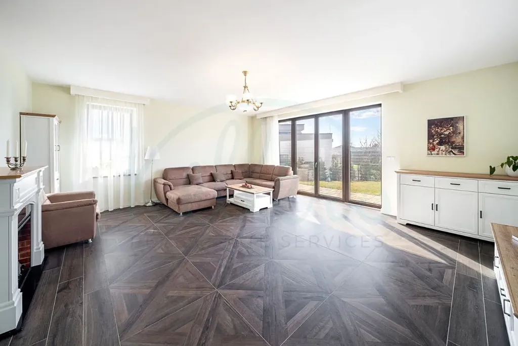 Dům nabízí velkorysou podlahovou plochu přibližně 244 m². Dominantou přízemí je světlý obývací prostor propojený s kuchyní a jídelnou, odkud je přímý vstup na terasu a do zahrady. Dále je zde ložnice s vlastní koupelnou a šatnou, samostatné WC, vstupní předsíň, technická místnost a garáž pro dva vozy. V patře se nachází další tři pokoje, koupelna a dvě šatny, přičemž z pokojů je přístup na balkony a terasu s výhledem do okolí. V ceně domu je kuchyňská linka s pracovní deskou z umělého kamene a spotřebiči značky Bosch. Dům se nabízí bez nábytku, což novému majiteli umožňuje přizpůsobit si interiér přesně podle vlastních představ.