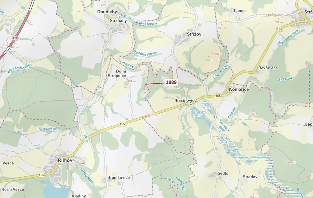 Lesní pozemek o výměře 365 m2, parcelní číslo 1889, podíl 1/1, katastrální území Dolní Stropnice, obec Římov, obec s rozšířenou působností České Budějovice, okres České Budějovice, Jihočeský kraj.