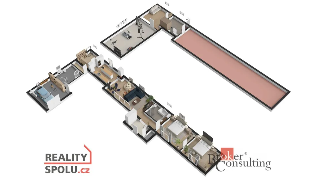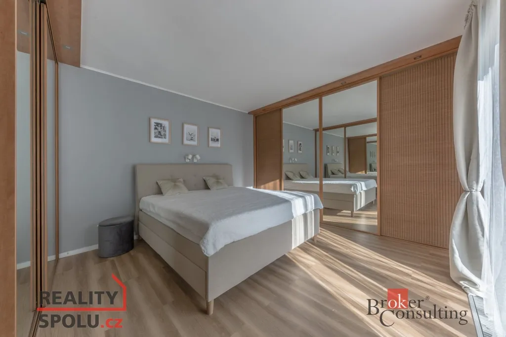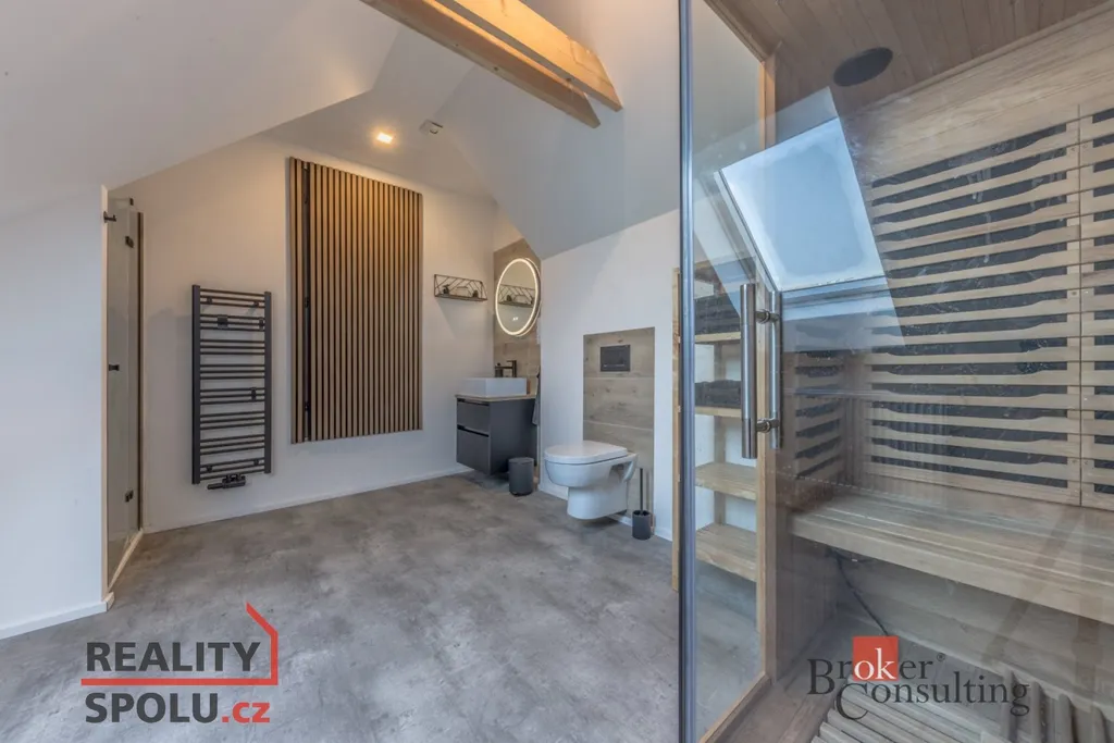 Dispozice domu: na přízemí se nachází vstupní hala, koupelna s vanou, sprchovým koutem, toaletou s umyvadlem, dvěma ložnicemi, kde každá disponuje prostornou vestavnou šatní skříní. Světlý obývací pokoj s jídelnou je útulný i díky krbovým kamnům, navazující kuchyň umožňuje propojení s obývacím pokojem, je zde i prostorný špajz. Z kuchyně je přímý vstup na terásku za domem, kde lze ráno ráno posnídat. Hlavní venkovní sezení je situované u obývacího pokoje v zahradě. Samostatně přístupná technická místnost, která slouží i jako prádelna, s pračkou a se sušičkou je hned vedle garáže (22 m2). Do patra se dostaneme po točitých schodech, tuto část majitelé využívají pro relaxaci. Najdeme zde velkou koupelnu s toaletou, se sprchovým koutem, saunou, odpočívárnu a prostornou pracovnu s fitness koutem.