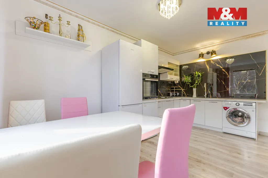 Nabízíme k prodeji velmi vkusně upravený a světlý byt 3+kk, situovaný v klidné a žádané lokalitě. Interiér prošel modernizací a na první pohled zaujme svou čistou linií a vzdušností. Dominantou je velkorysý obývací pokoj s kuchyňským koutem, který je vybaven moderní linkou v bílém lesku s vestavěnými spotřebiči a luxusní tmavou zástěnou s mramorovým dekorem. Obývací část zdobí designová TV stěna s fialovým podsvícením a vestavěným elektrickým krbem, který vnáší do domova jedinečnou atmosféru. V celém bytě je položena nová plovoucí podlaha a osazena jsou plastová okna. Koupelna disponuje sprchovým koutem, toaleta je řešena samostatně pro zajištění maximálního soukromí. Přesné a praktické uspořádání všech místností naleznete na přiloženém půdorysu. Lokalita nabízí výbornou dostupnost veškerých služeb i MHD. Financování zajistíme pomocí našeho finančního centra. Pokud Vás nabídka zaujala, neváhejte si domluvit prohlídku.