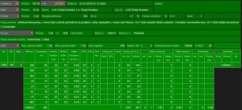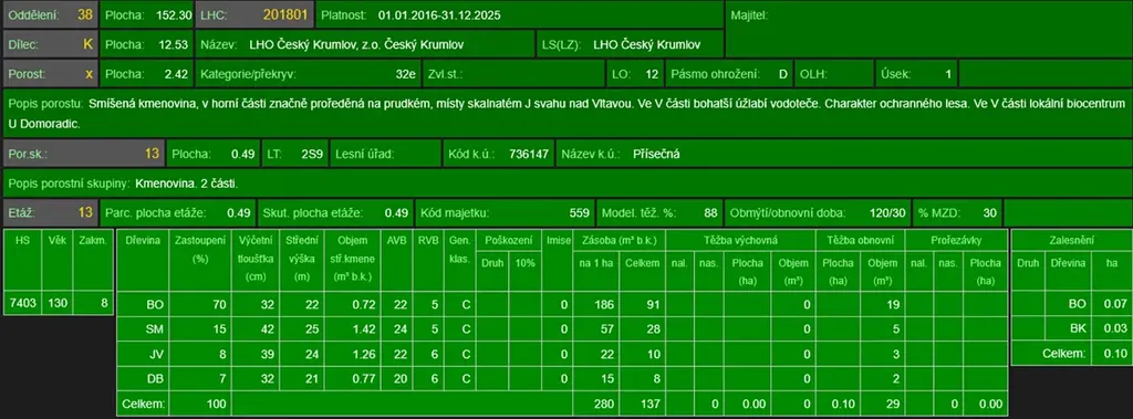 - p.č. 111/41 vedená jako lesní pozemek o celkové výměře 15 088 m2 (stáří lesa 140 let - zastoupení dřevin borovice, smrk, javor, dub, stáří lesa 99 let - dub, smrk, bříza, jasan, javor, lípa, modřín).