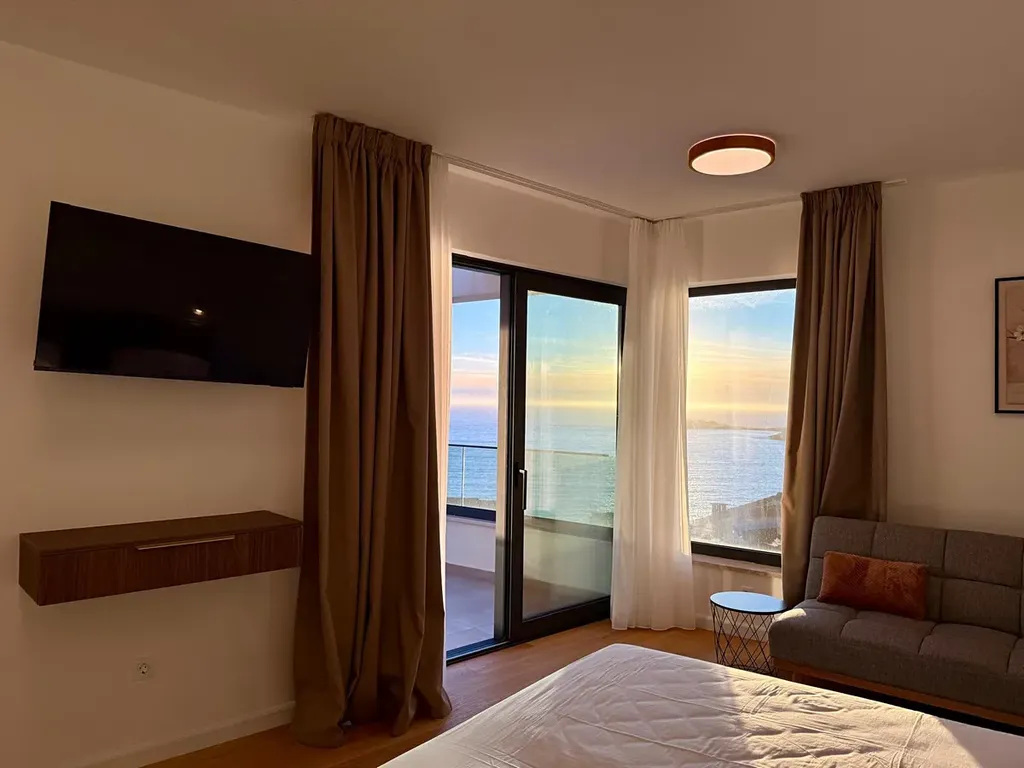 Vstup na pozemek je ze severní strany, nad úrovní přízemí, odkud se k hlavnímu vchodu schází po několika schodech z parkoviště. V přízemí se nachází toaleta, skladovací místnost, prostorný obývací pokoj s kuchyní a velká terasa s úžasným infinity bazénem, letní kuchyní a venkovní jídelní částí. Umístění pohovky i jídelního stolu umožňuje přes velké posuvné skleněné dveře vychutnávat nádherný výhled na moře. Infinity bazén ve tvaru U má část s vířivkou a masážními tryskami a je umístěn na stejné úrovni jako přízemí.