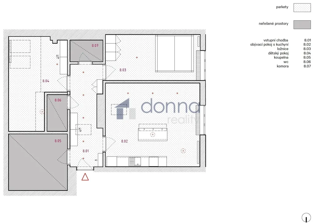 Mnoho úložných prostor ve vestavěných skříních na chodbě a komoře.