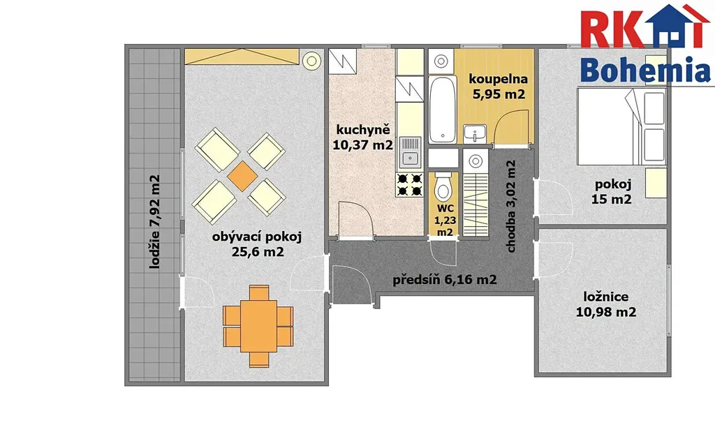 - Dominantní obývací pokoj (25,6 m2) se vstupem na prosluněnou lodžii.