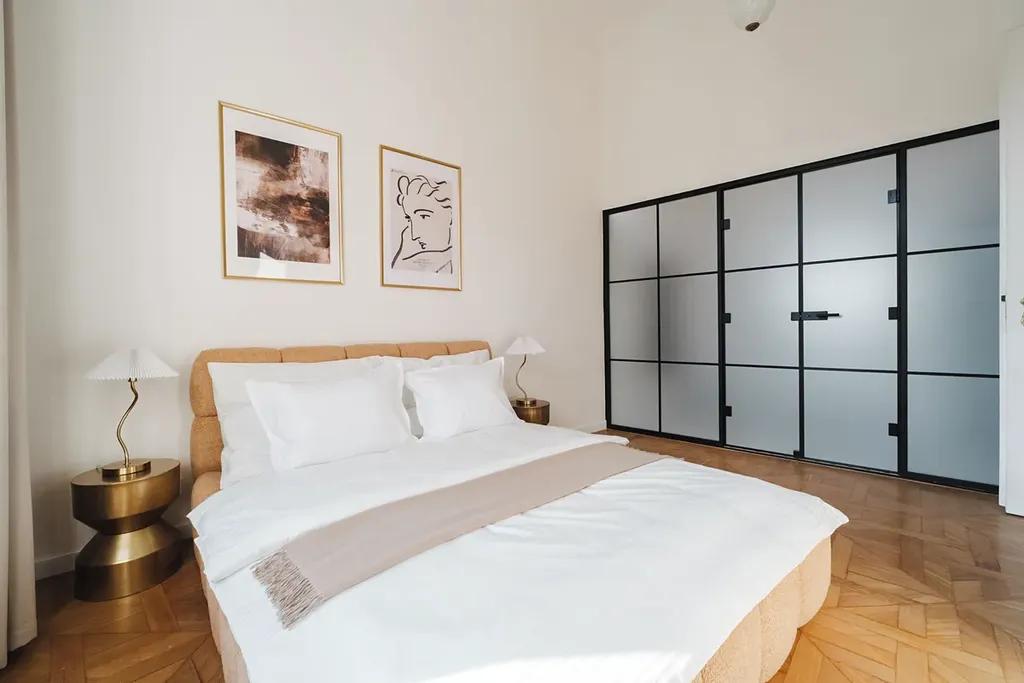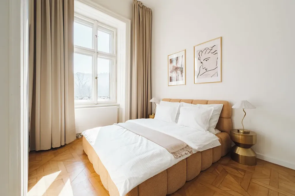 Dispozice bytu nabízí čtyři samostatné ložnice, tři moderní koupelny a prostorný obývací prostor s kuchyňským koutem, který je plně vybaven všemi spotřebiči. Součástí bytu je kvalitní nábytek, high-tech vybavení a dostatek úložných prostor. Velká okna zajišťují dostatek světla a zároveň poskytují jedinečný výhled na historické centrum Prahy a budovu Národního muzea.