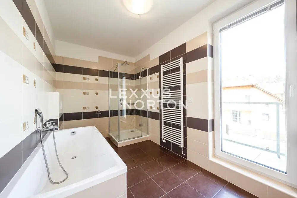 Kuchyňský kout je plně vybavený lednicí s mrazákem, plynovou varnou deskou, troubou, mikrovlnnou troubou a myčkou nádobí. Koupelna v přízemí disponuje sprchovým koutem, bidetem a toaletou. V horním patře se nacházejí dvě koupelny, každá s toaletou, sprchovým koutem nebo vanou. Nemovitost nabízí řadu praktických prvků, jako jsou vestavěné skříně, parkety, plovoucí podlahy a dlažba, půdní úložný prostor, plynové vytápění, satelitní TV připojení a alarm s možností napojení na bezpečnostní agenturu.