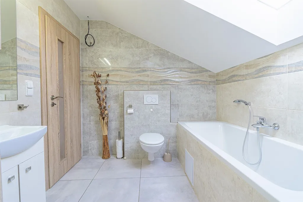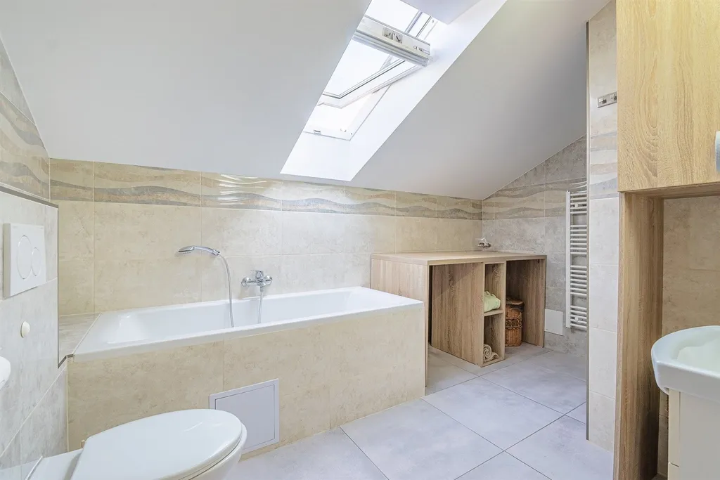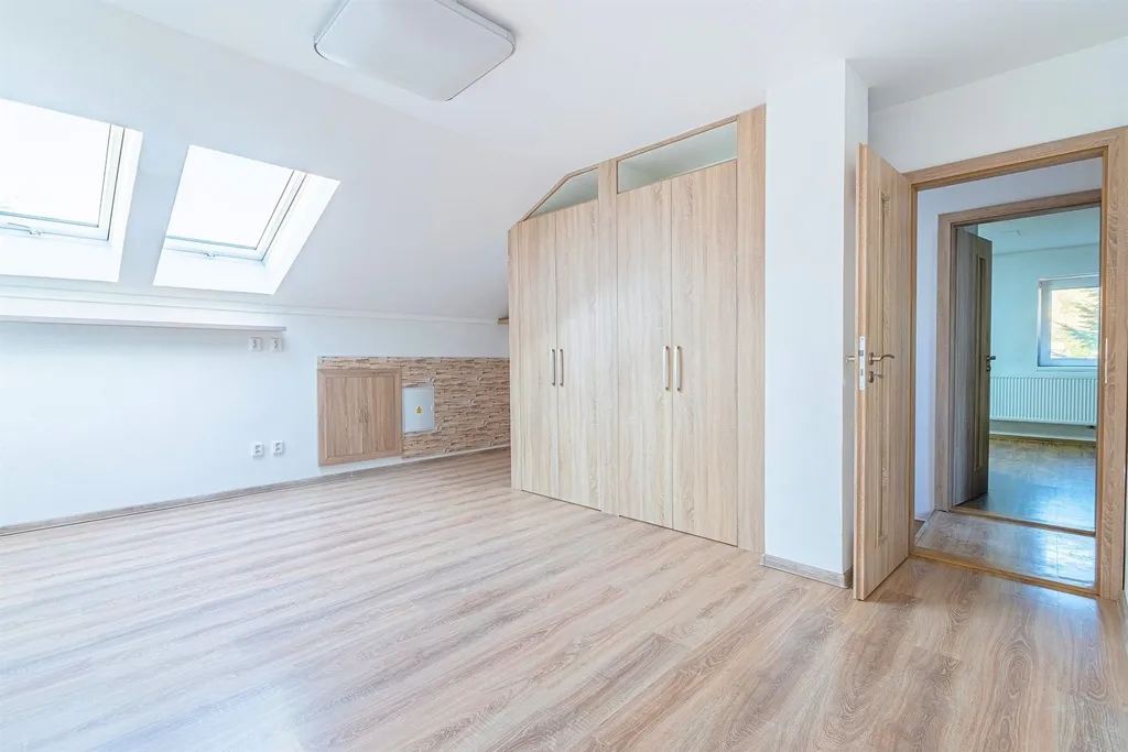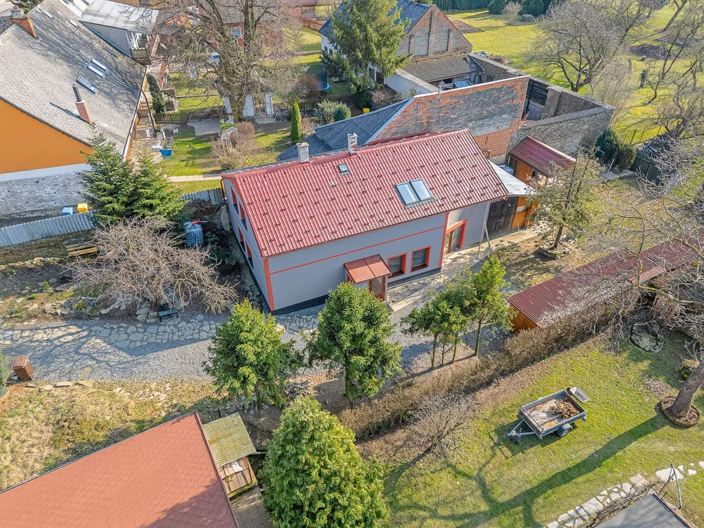 Dispozice: vstup zádveří chodba kuchyně s jídelním koutem spodní koupelna se sprch. koutem a prostorem pro pračku obrovský obývací pokoj s výstupem přes portál na dvůr/zahradu technická místnost (kotel, zásobník, bojler, expanzka) WC samostatné schodiště do patra. V patře 3 pokoje (jeden průchozí) prostorná koupelna s vanou, sprchovým koutem a s WC.