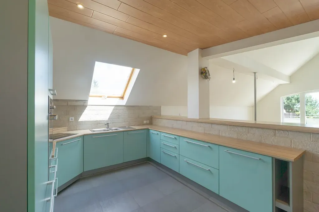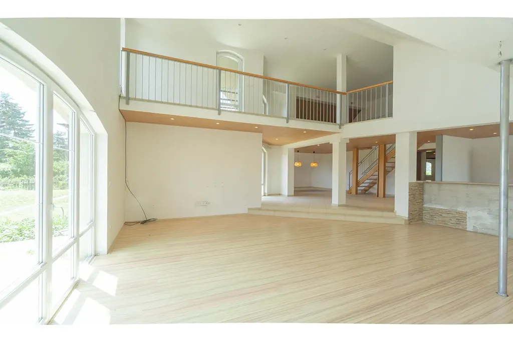 nadzemním podlaží je vstupní hala (13,6 m2) a hlavní obytný prostor - nalezneme tu velkorysý prostor tvořený obývacím pokojem (44,2 m2), na něj navazující jídelnou (33,3 m2) a kuchyní (12,1 m2), která je oddělena barovým pultem. Celý prostor je velmi vzdušný a otevřený směrem na jihovýchod do zahrady, dojem životního prostoru umocňuje vysoký strop zasahující až ke galerii ve druhém nadzemním podlaží. Prostory ještě doplňuje prostorný balkon (10,2 m2). Vyjma hlavní obývají části v nižším patře nalezneme ještě koupelnu s vanou (10,8 m2), samostatné WC (1,9 m2) a tři útulné pokoje/ ložnice (17,4 + 15,6 + 10,4 m2). Prostory ve vyšším patře tvoří galerie (33,6 m2), balkon (5,2 m2) a původní technická část/ půda (45,2 m2), která může být přetvořena na další obytné prostory.