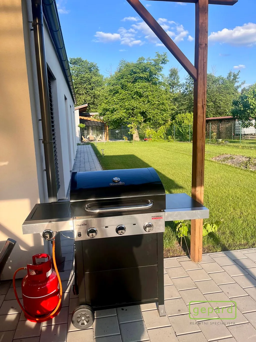 Rodinný dům má spousty superlativ, je skvěle dispozičně řešený a velkým benefitem je osvětlená venkovní terasa přístupná z obývacího pokoje s výhledem do okolní udržované zahrady se vzrostlými ovocnými stromy a najdeme zde i jedlé keře, živý plot s arónií, muchovníku a mnoho dalšího. Součástí zahrady je dřevěný zahradní domek s plechovou krytinou na ploše 4x5 m2. Kolem domu je zámková dlažba, kde lze zaparkovat až 5 osobních automobilů. Dům je nekuřácký a preferujeme dlouhodobý pronájem bez domácích mazlíčků.