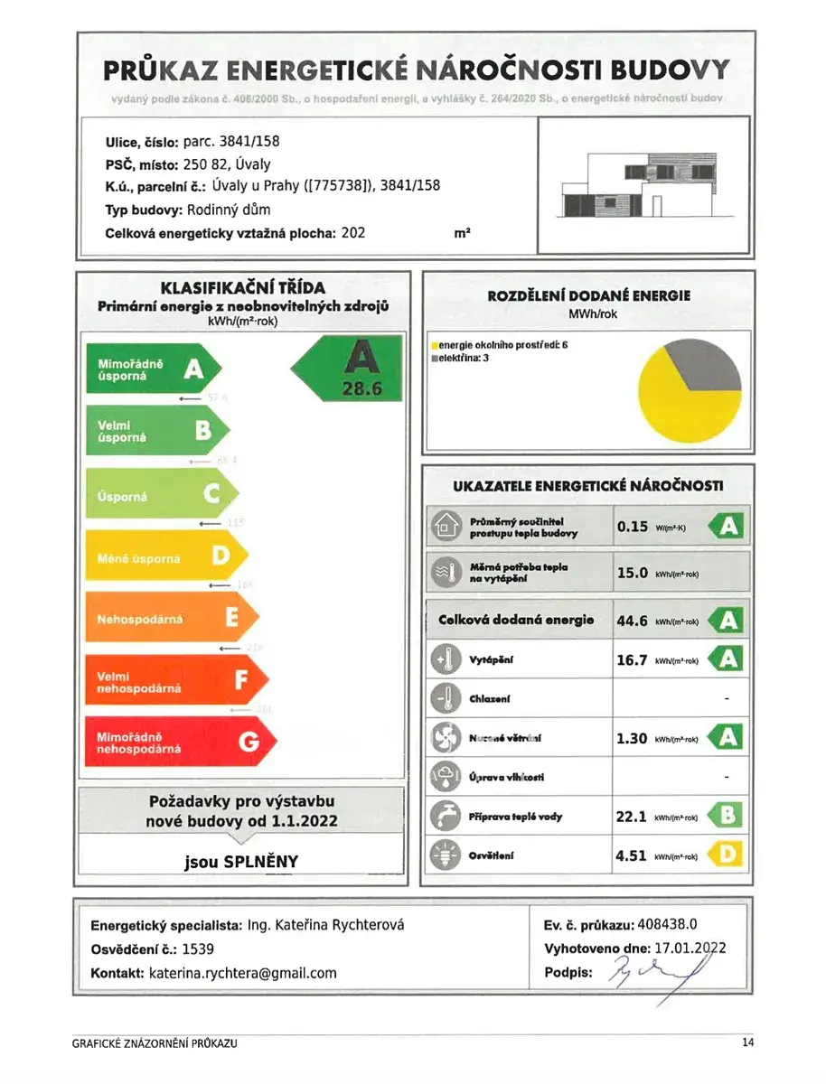 | Ukazatel energetické náročnosti | 28.6 kWh/m2 za rok |