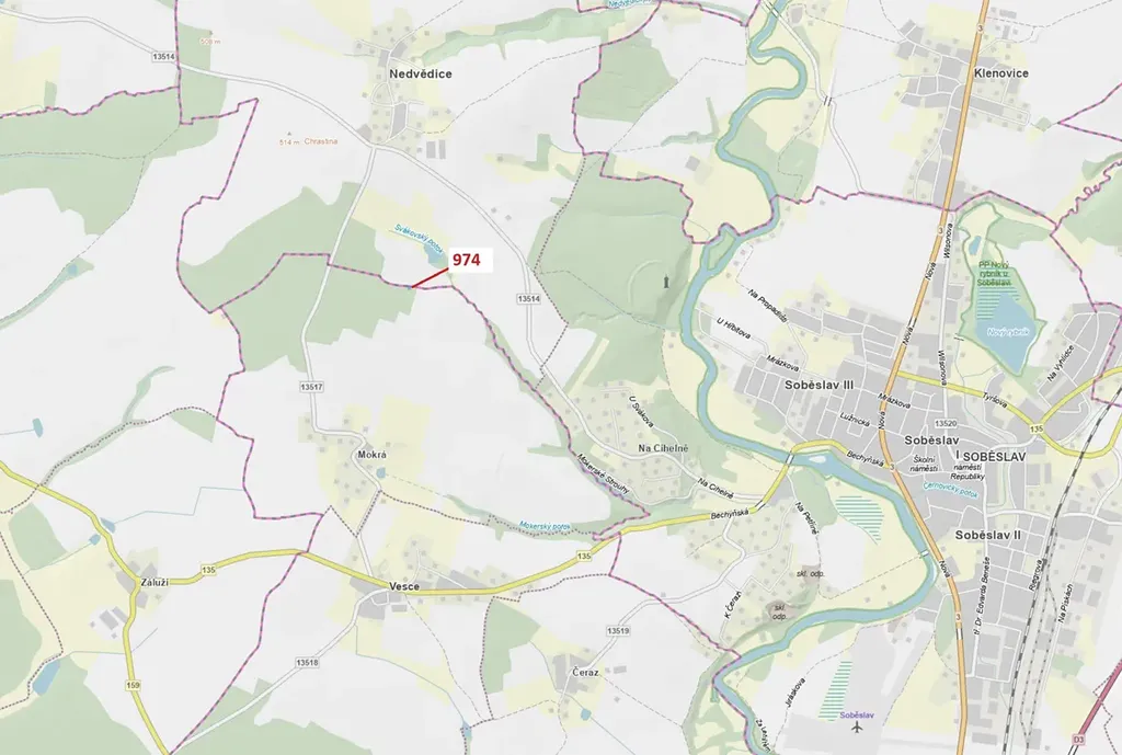 Lesní pozemek o výměře 260 m2, parcelní číslo 974, podíl 1/1, katastrální území Mokrá u Soběslavi, obec Vesce, obec s rozšířenou působností Soběslav, okres Tábor, Jihočeský kraj. Po těžbě.